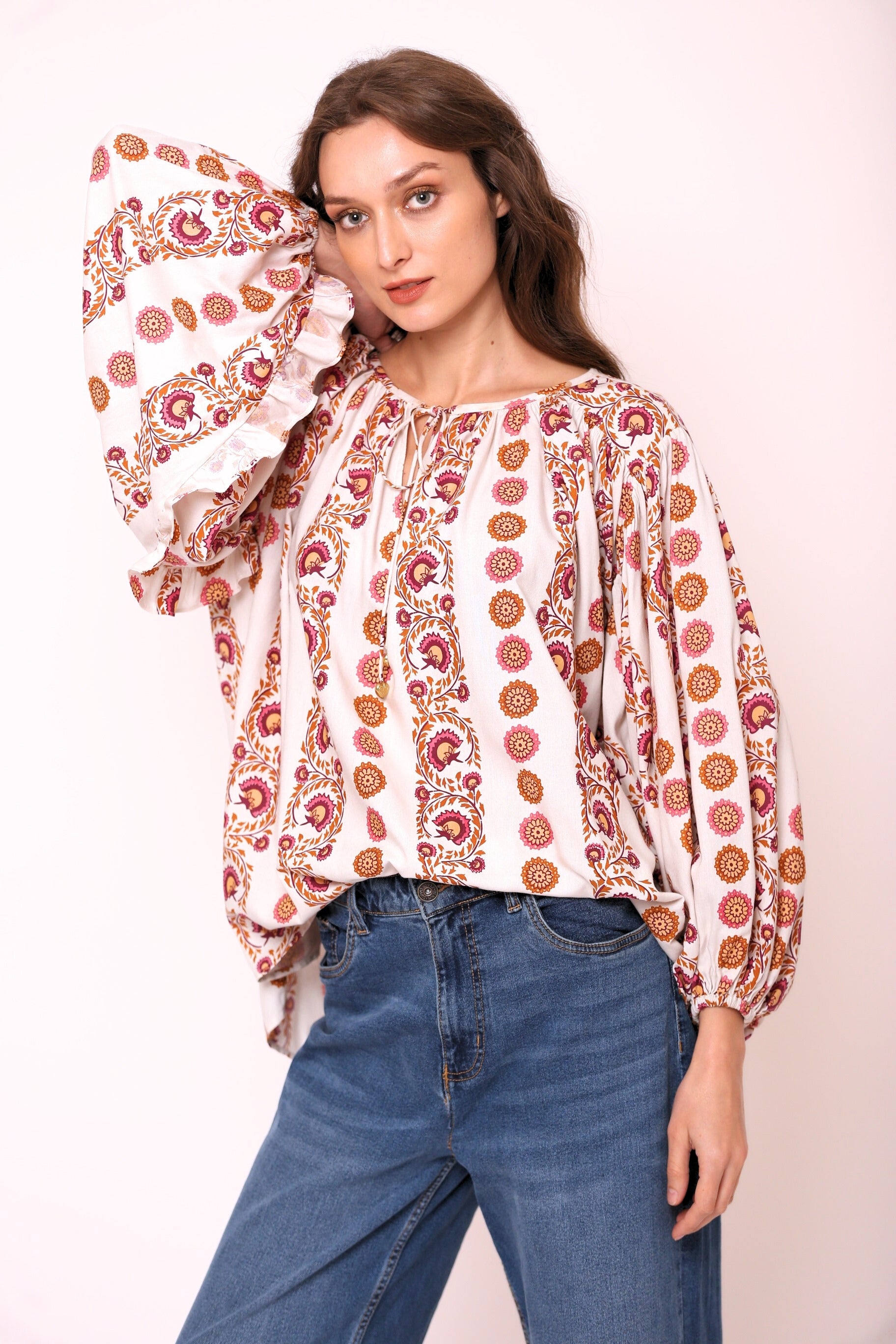 The Julia is an effortless, airy silhouette with full blouson sleeves. The versatile top features an open neckline with a delicate self-tie closure adorned with hand-made brass hearts. Tuck it into our high-waisted Teresa pants or pair it with Denim for a more casual look. Julia is made from ultra soft, plant-based Viscose that drapes beautifully. The print aims to portray the sunrise on top of a mountain, minute by minute bathing the nearby plateaus and valleys in hues of blue, pink, yellow and orange.