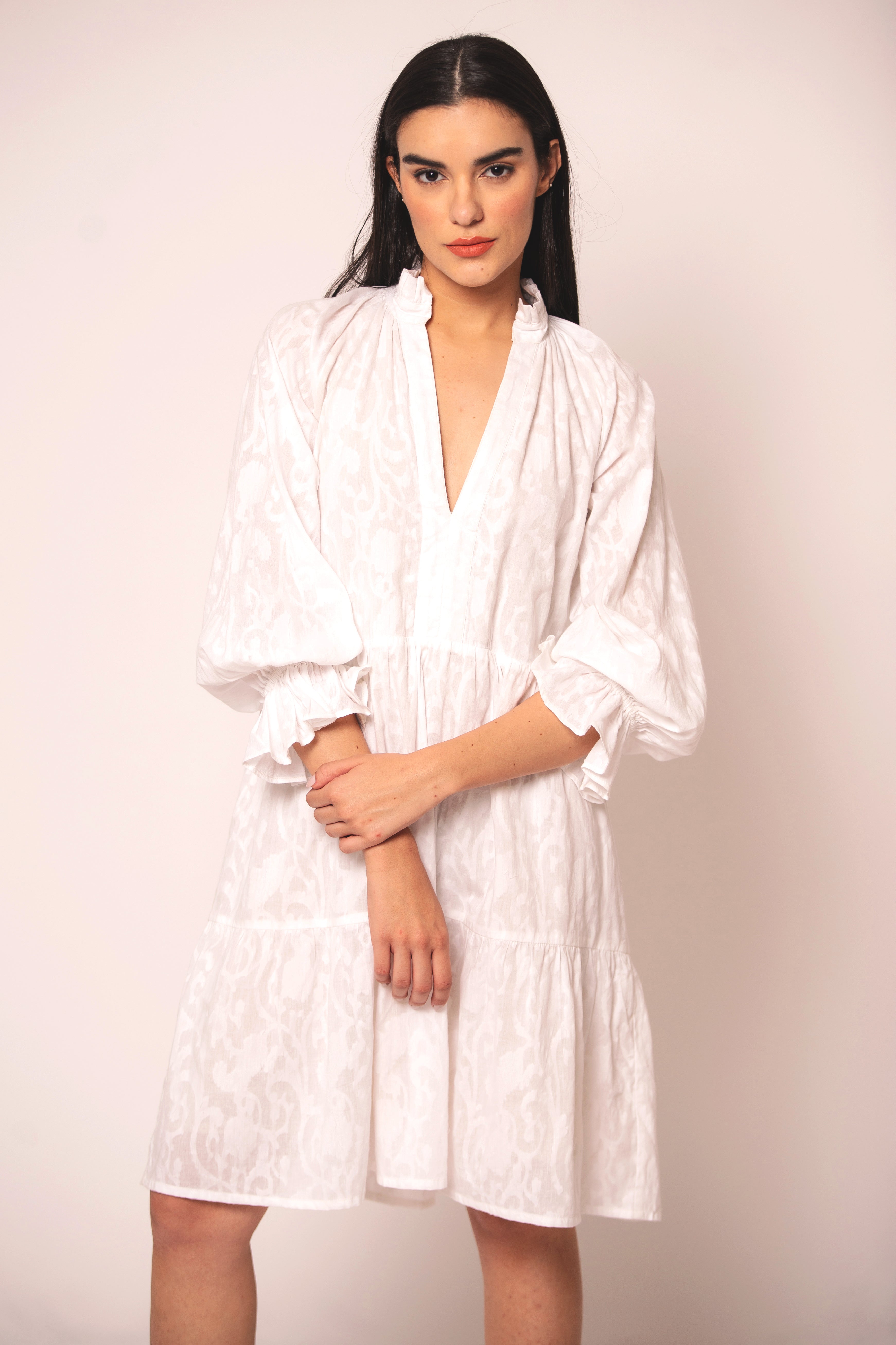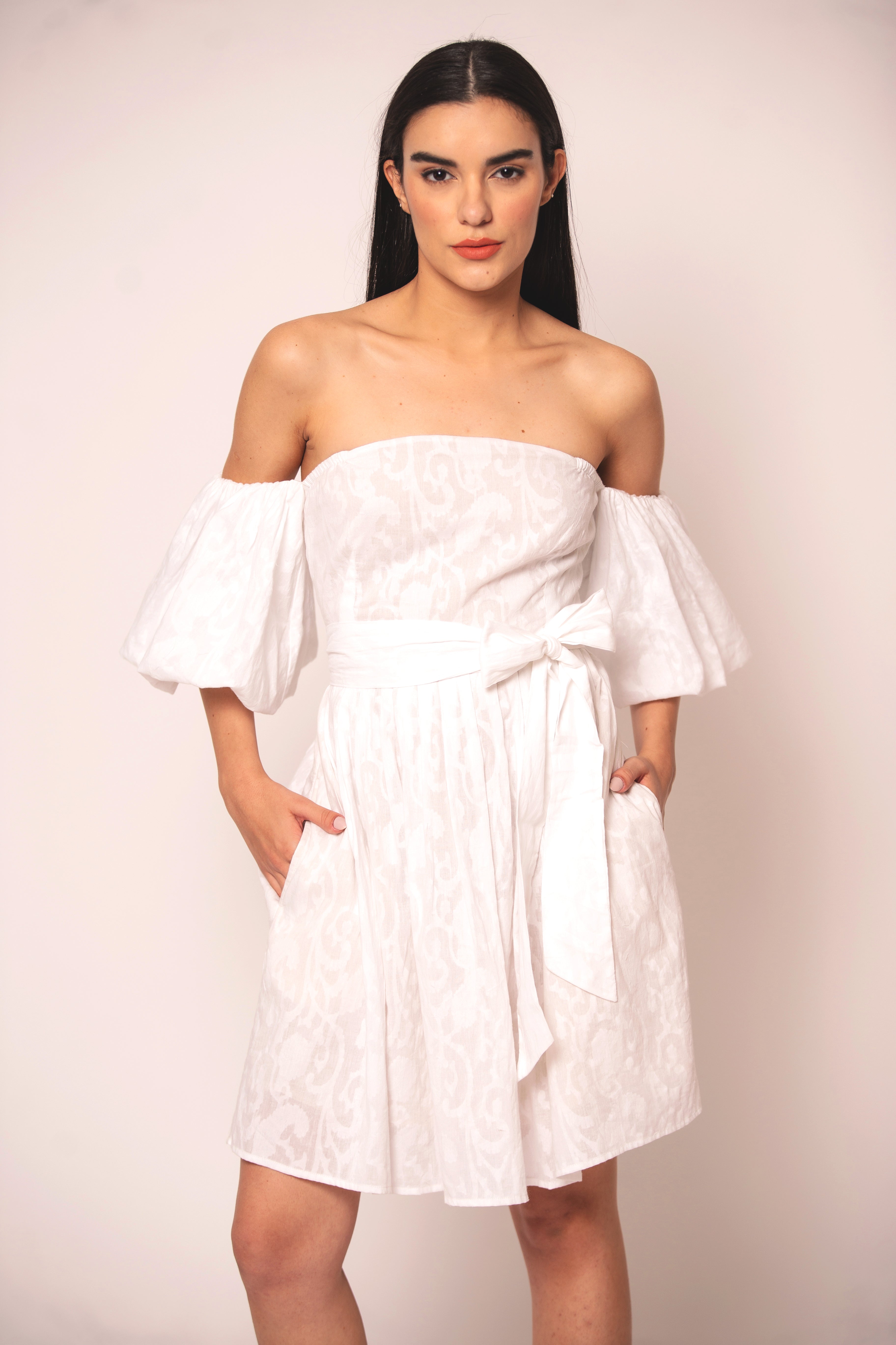 The flirty and glamourous Leah dress features romantic off the shoulder bubble sleeves, a fitted waist and a flattering A-line skirt with a self-tie belt. Leah is crafted from luxurious, lightweight cotton jacquard fabric showcasing an intricate floral pattern. The Jacquard weave references the antique French décor of Pondicherry's historic mansions.