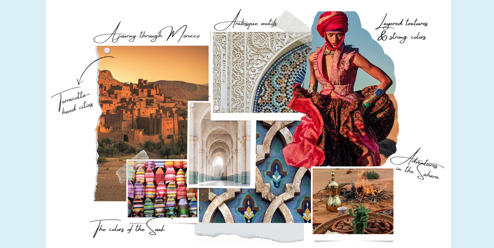 Fall/Winter '24 takes you to Morocco, a kingdom in North Africa with Moorish, Berber, Arabic, and Andalusian influences. Our vibrant prints celebrate arabesque motifs and reference iconic Moroccan architecture, heritage and Morocco’s scenic beauty. From Marrakesh's terracotta to Chefchaouen's hues of blue and the sand of the Sahara, our earthy tones paint a vivid picture of the country’s culture and landscapes.