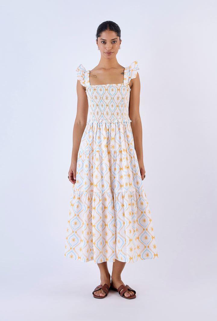 Our bestseller Mia dress has been upgraded! The playful midi dress, known for its beautiful tiered ruffle skirt and ever-so-flattering smocked bodice, now features elasticated flutter sleeves for a sophisticated look. This romantic silhouette is perfect for dinner dates, weekend brunches, and garden parties. Mia is crafted from breathable premium Cotton Poplin. The print design ‘Treasures’ draws inspiration from handmade pearl and shell bracelets, symbolizing cherished souvenirs that whisk you back to those sun-kissed moments by the shore.
