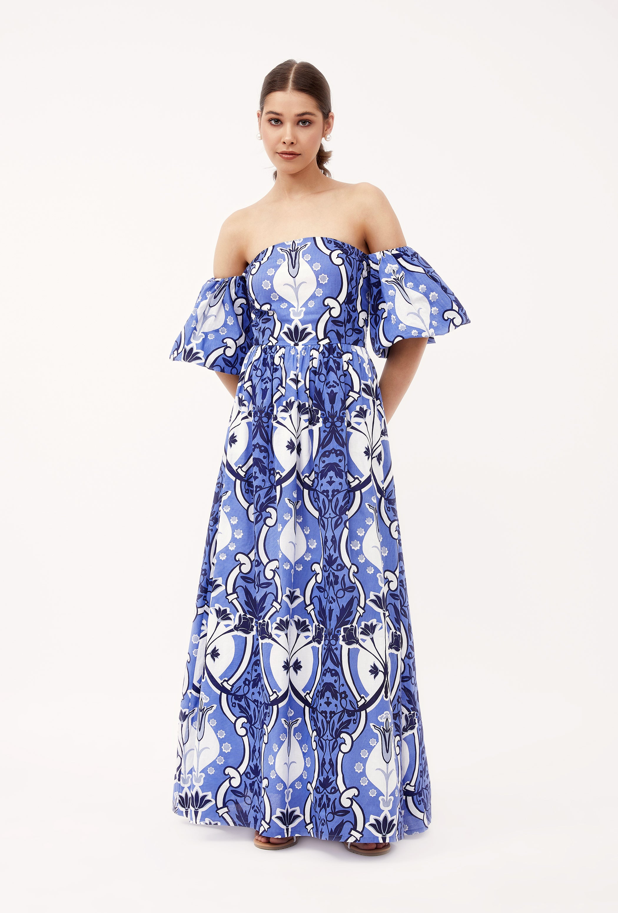 The flirty and glamourous Leah dress features romantic off the shoulder bubble sleeves, a fitted waist and a flattering A-line skirt. Perfect for summer soirées, garden parties, or a romantic dinner under the stars. Leah is made from a soft, breathable cotton cambric fabric that will keep you cool on a hot summer day. Inspired by ornamental stone railings of Lake Como's grand villas, this print exudes grandeur and elegance.