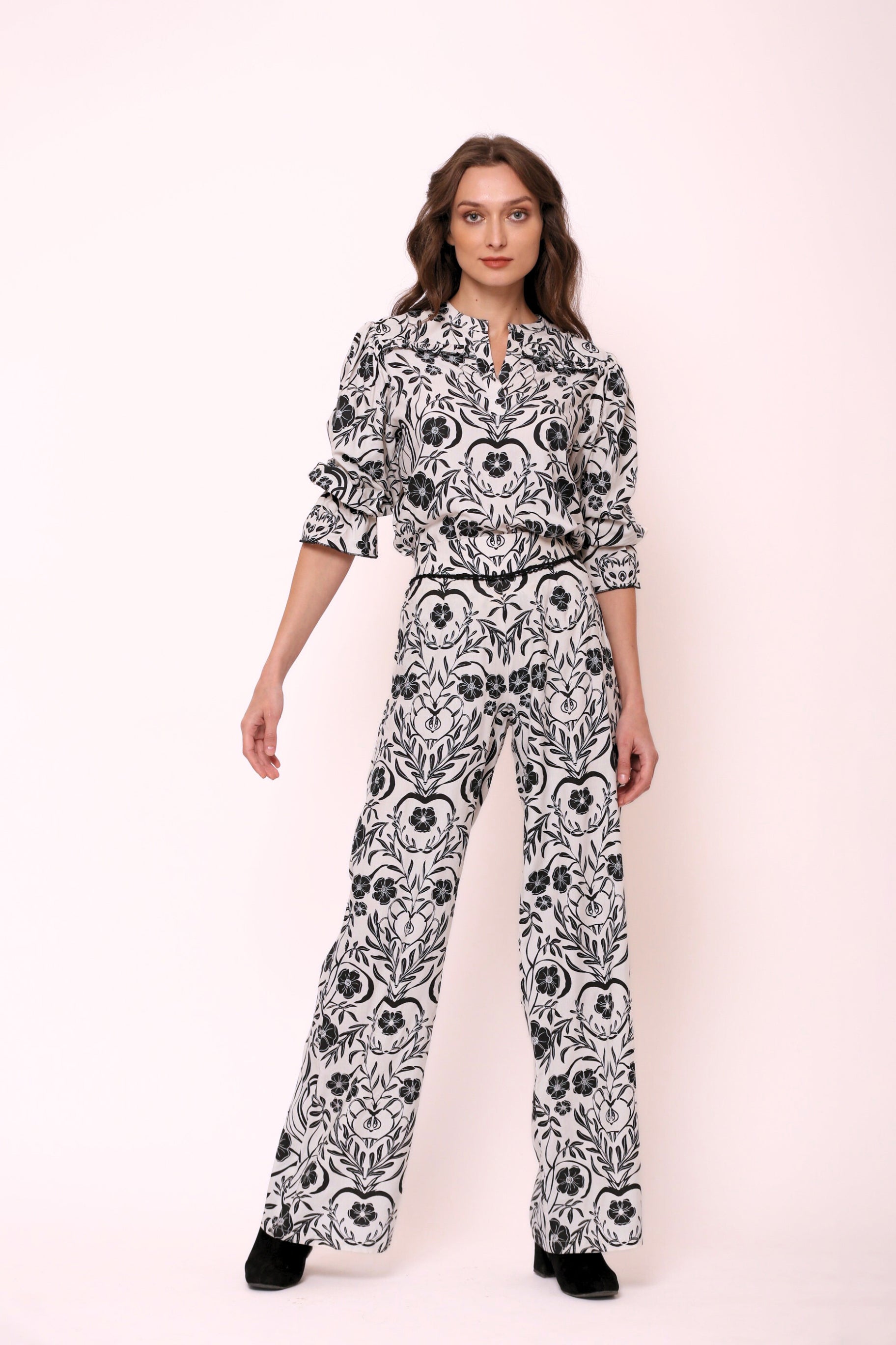 Our Teresa pants are so elegant, yet so effortless. The flattering palazzo silhouette make the pants a fall favorite. The smocking in the back of the waist and self-tie belt guarantee the perfect fit. Teresa pants are made from plant-based Viscose that drapes beautifully. The print references the natural beauty of apple orchards in the apple-growing region of Austria’s highlands.