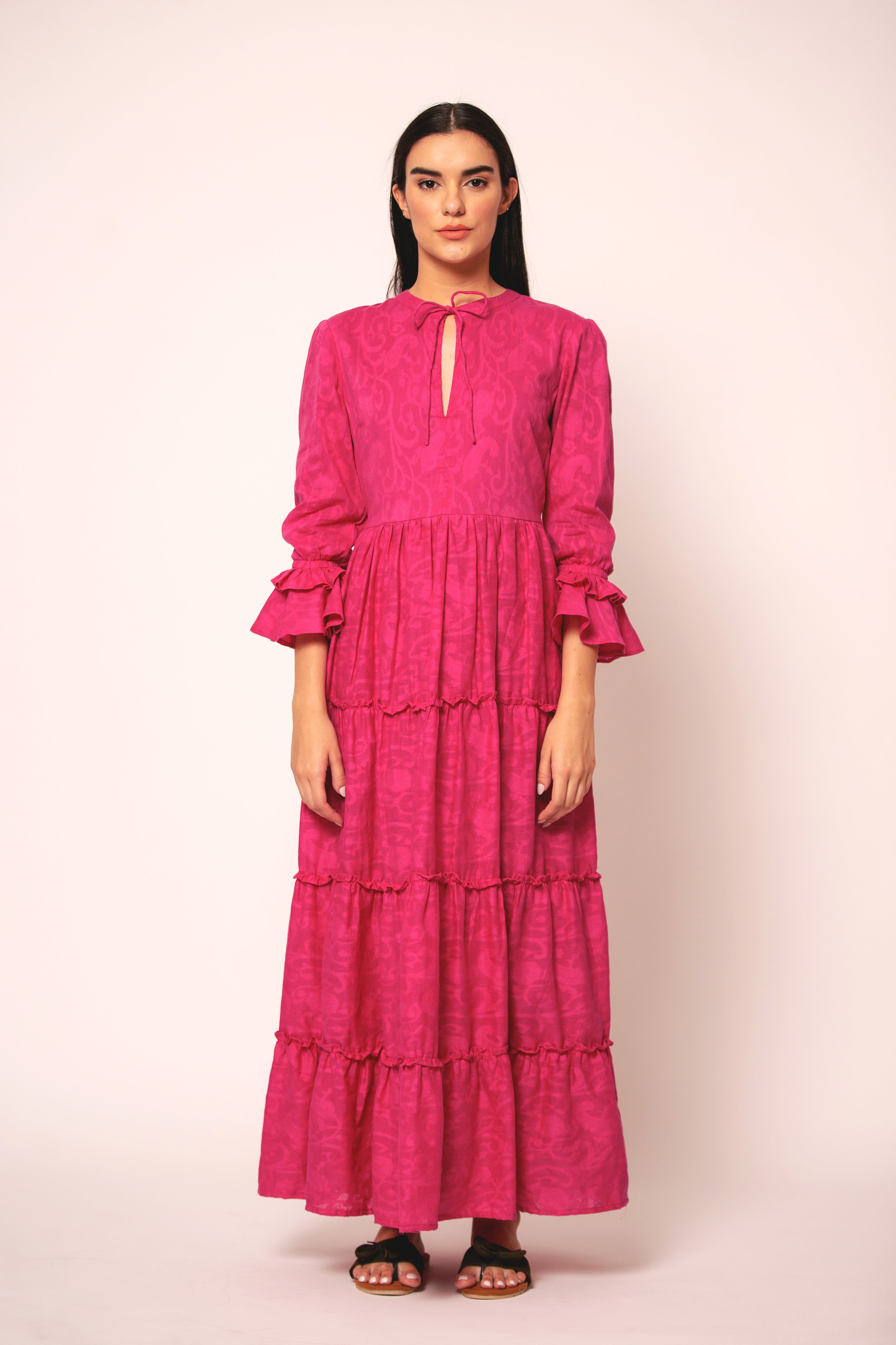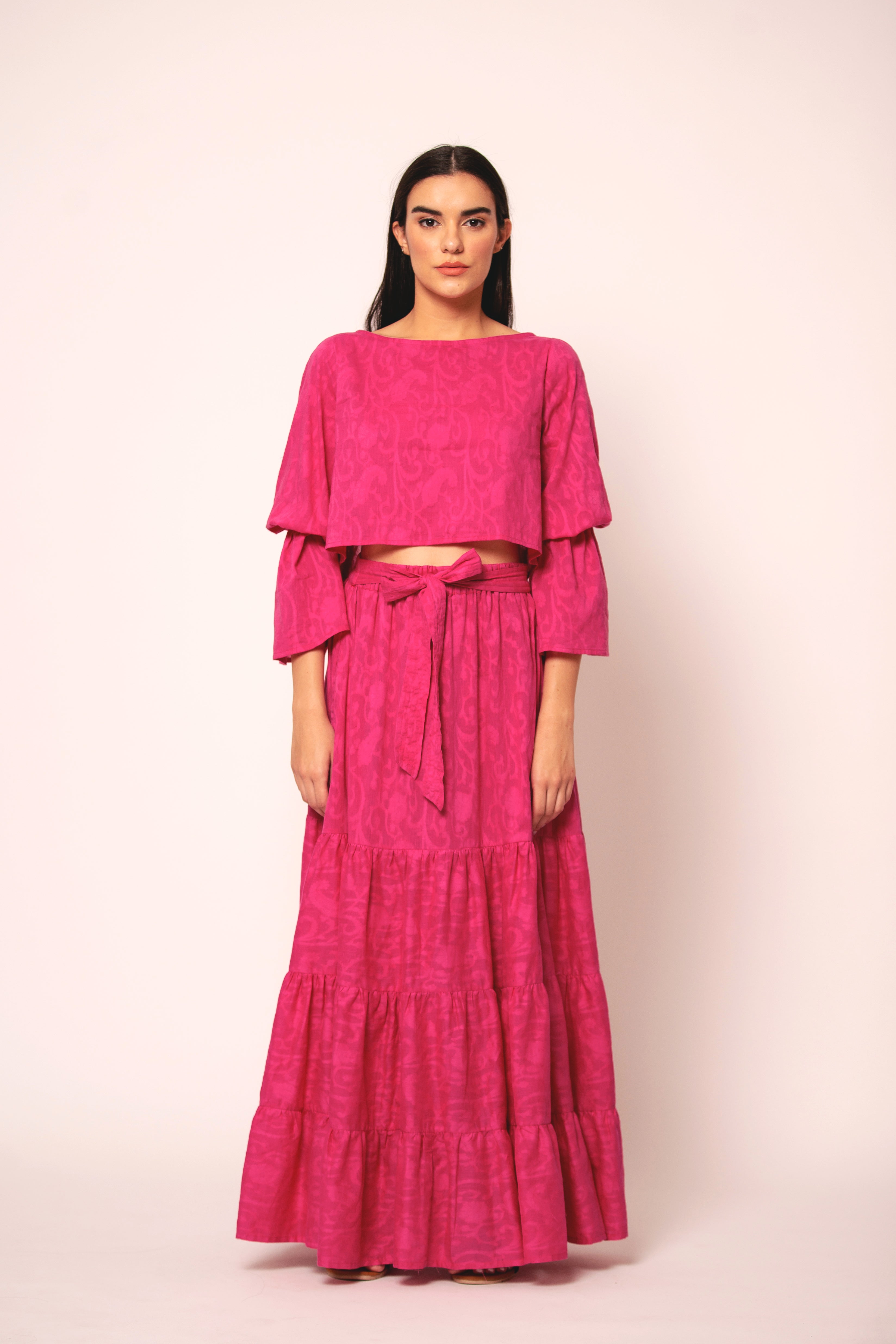 The Gia is a stunning Maxi skirt with a very comfortable fit that adjust to your body shape. Gia features a tiered A-line, an elastic waistband with attached self-tie belt and hidden pockets. Gia is crafted from luxurious, lightweight cotton jacquard fabric showcasing an intricate floral pattern. The Jacquard weave references the antique French décor of Pondicherry's historic mansions.