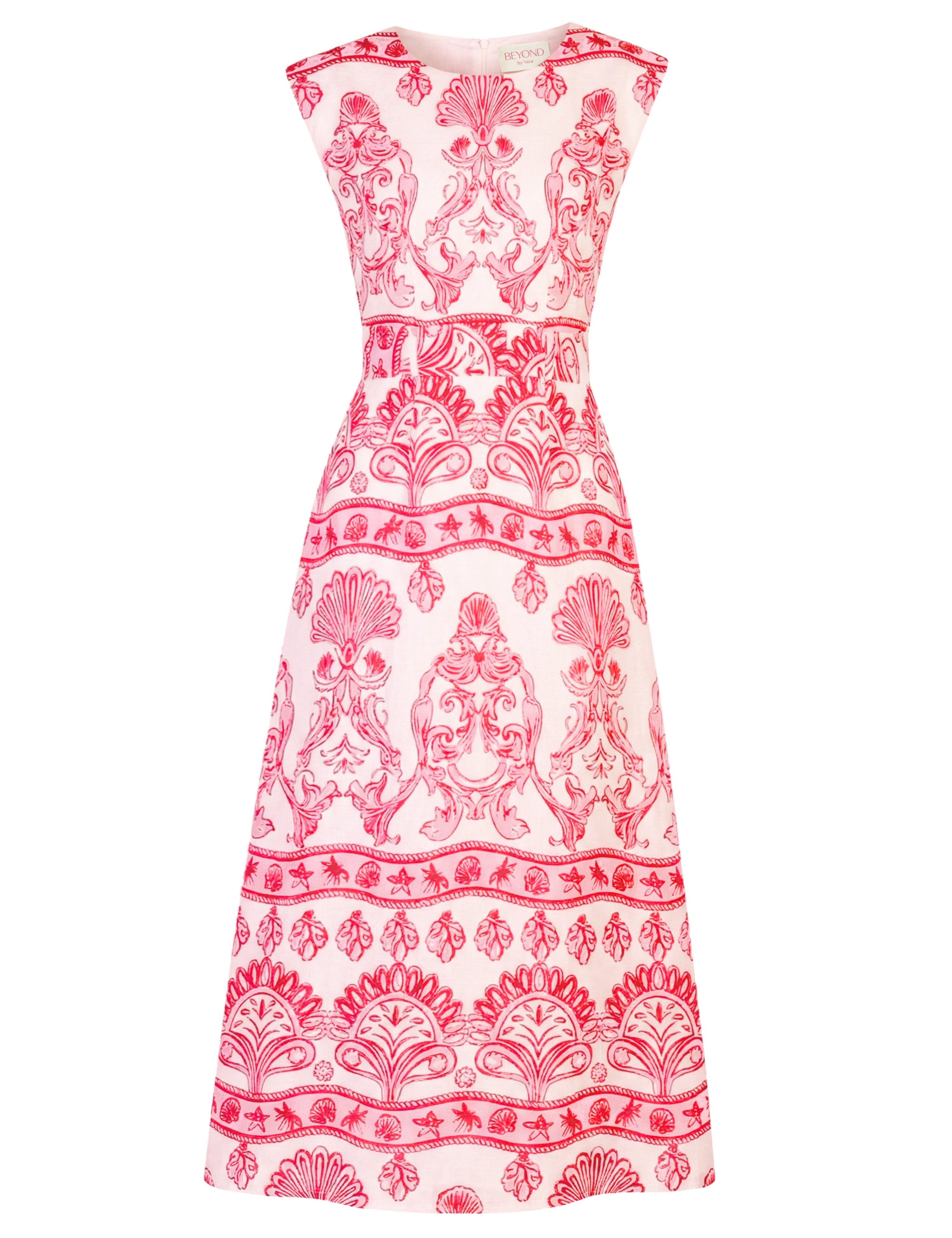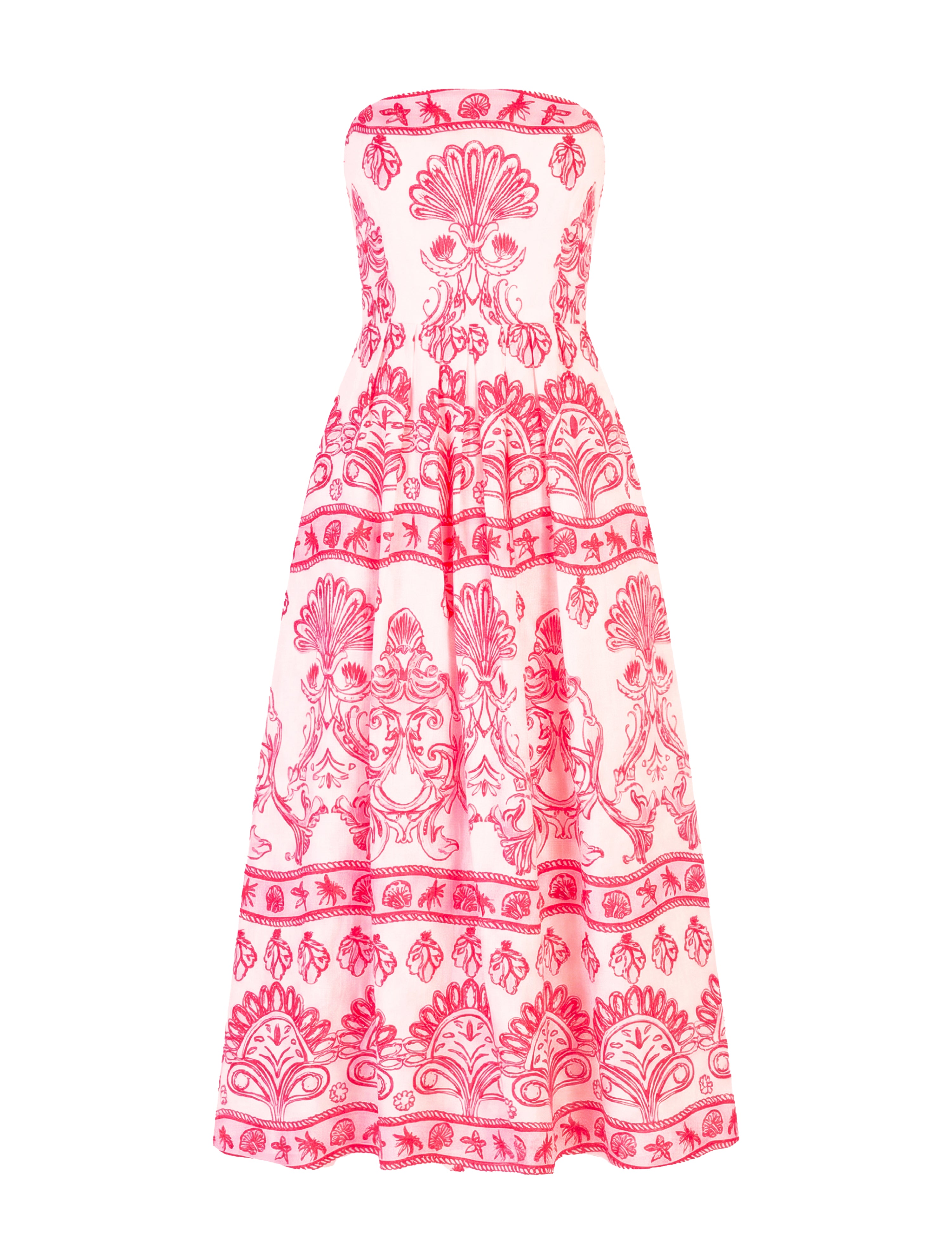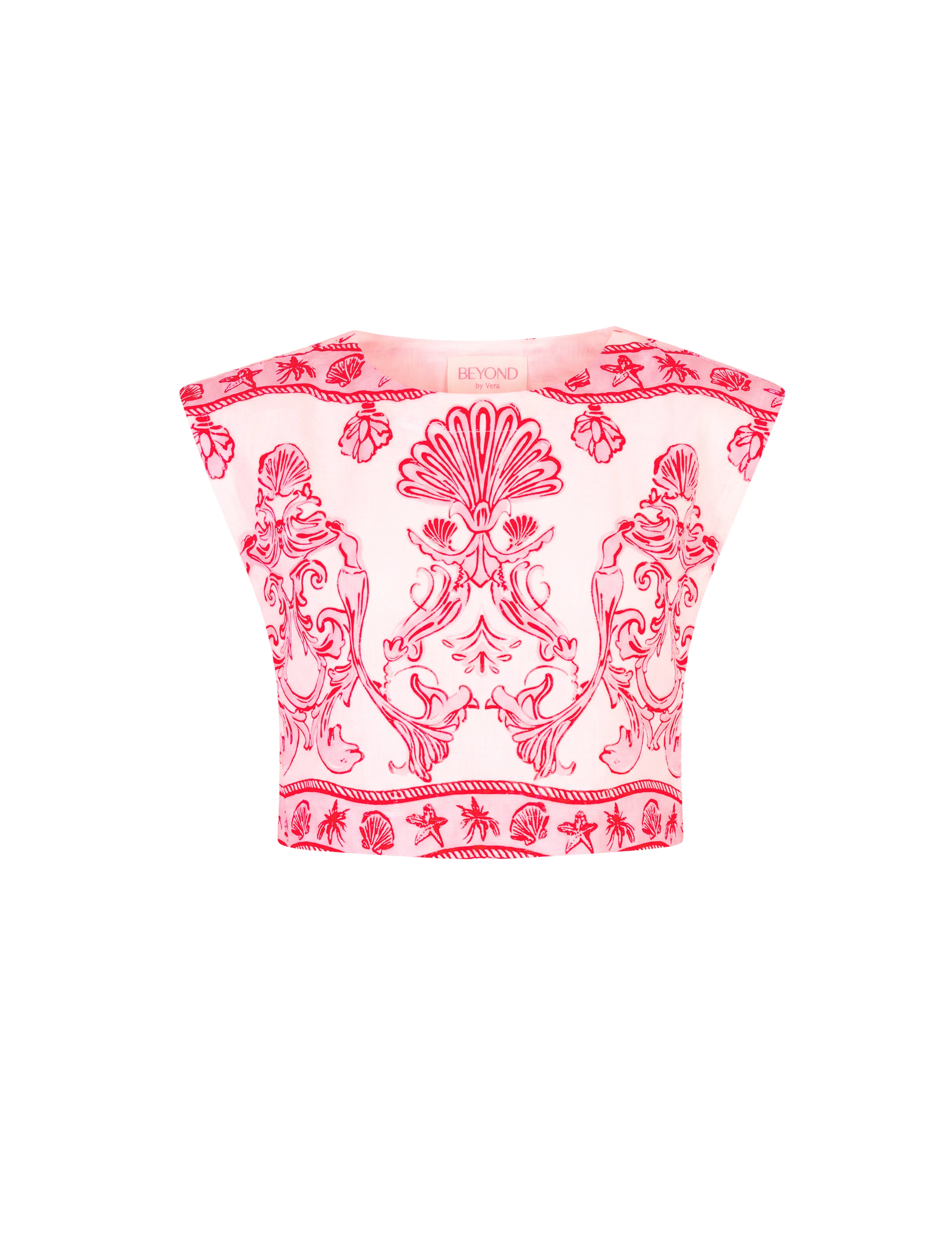 Meet the Kara skirt, a flattering drop-waist midi designed for easy elegance. Its chic silhouette is elevated by thoughtfully placed prints that make each piece feel truly special. Style it with the matching top for a refined set, or dress it down effortlessly with a simple tee. Kara is crafted from crisp cotton poplin, breathable and soft against the skin. This print channels the flair of poolside architecture from the golden era of the 1950s to ’70s. Sculpted fountains and mermaid figures in the design evoke a world of lavish detail and visual drama.