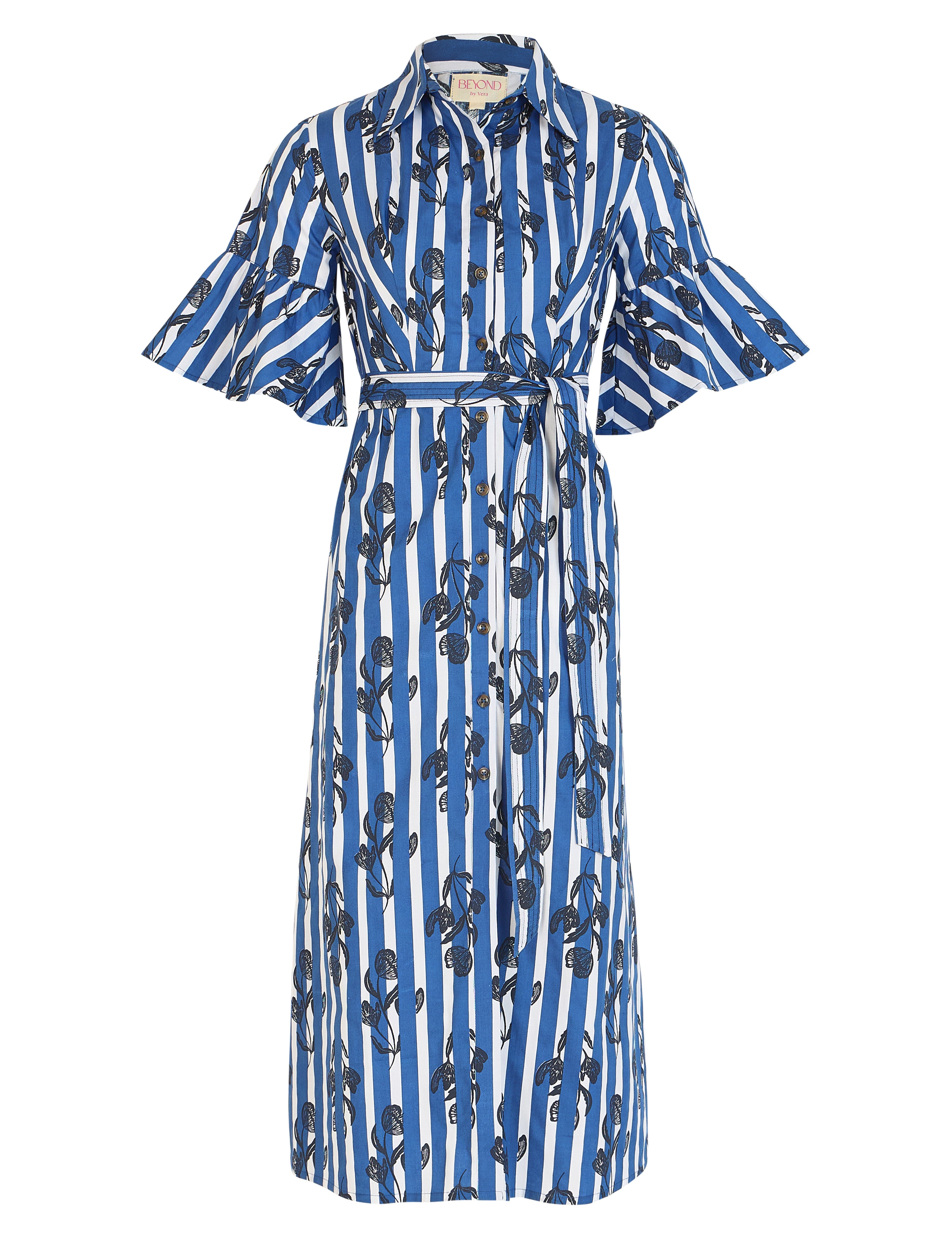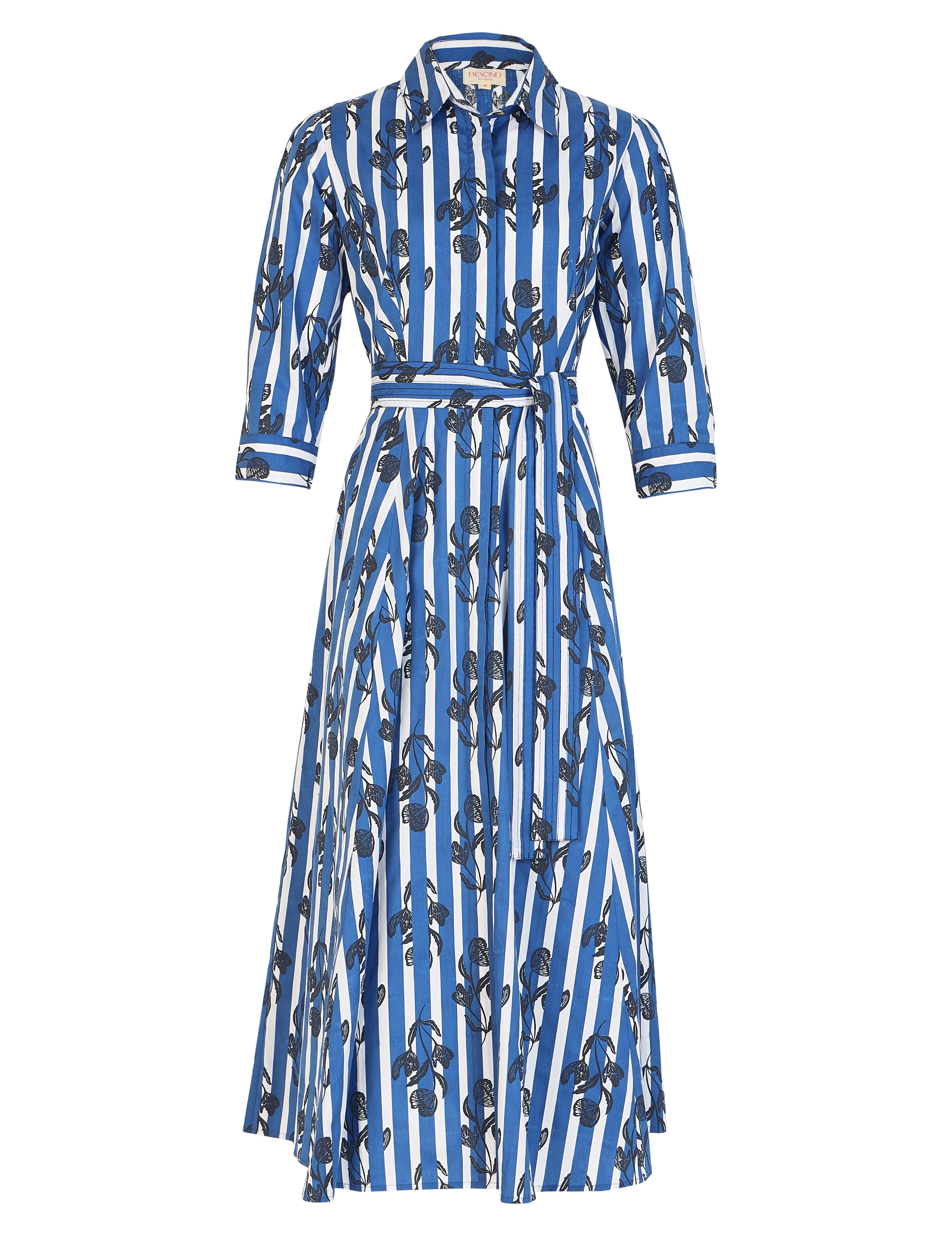Our popular Emily is a classic shirt dress with an elegant ease and flattering, effortless silhouette. The dress buttons down at the front and features 3/4 sleeves. Accentuate the waist with the featured belt. Emily is crafted from crisp cotton poplin, breathable and soft against the skin. The print is inspired by the idyll of a secluded forest cottage, where nature quietly reclaims its space. Lush wildflowers entwine a weathered fence, a testament to their resilience and enduring spirit.