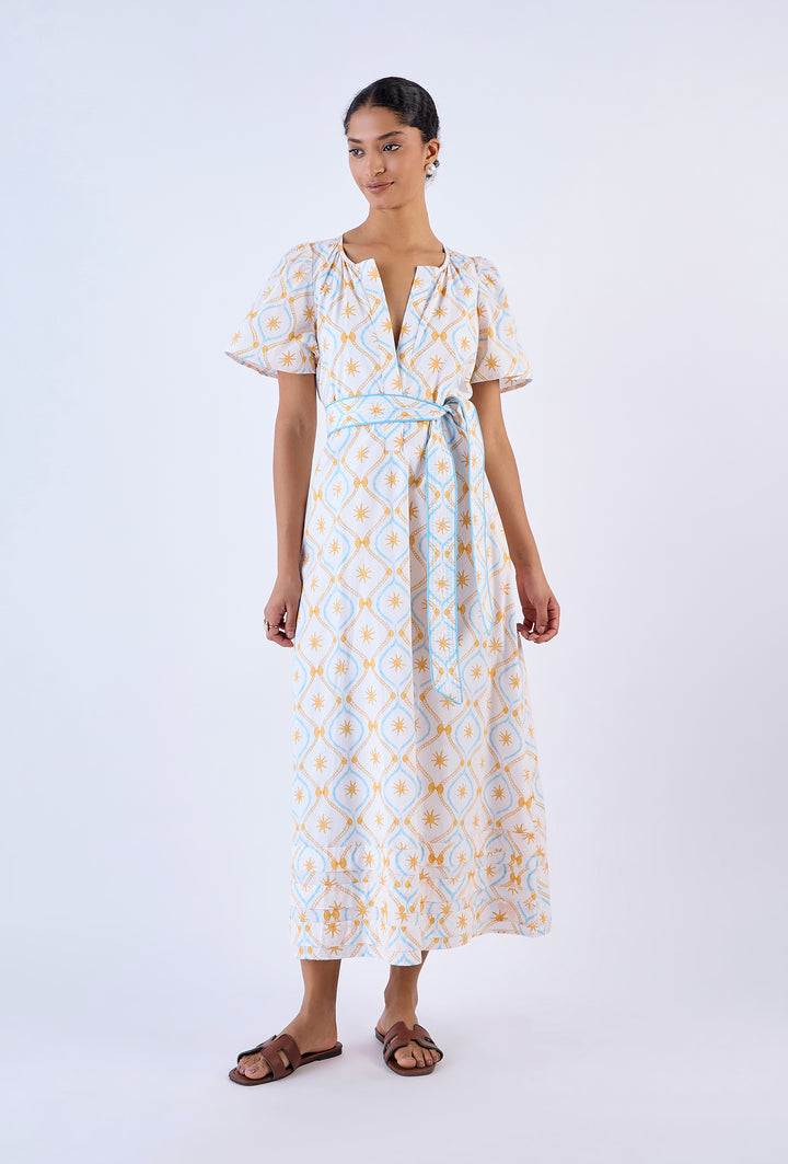 Meet Suzi, a versatile new silhouette designed to flatter all body types. The pullover midi dress boasts an adjustable V-neckline, semi-puff, straight sleeves and A-line skirt with pin-tucked details. The relaxed waist can be cinched with the included belt, making it an ideal dress to elevate your everyday style. Suzi is crafted from breathable premium Cotton Poplin. The print design ‘Treasures’ draws inspiration from handmade pearl and shell bracelets, symbolizing cherished souvenirs that whisk you back to those sun-kissed moments by the shore.