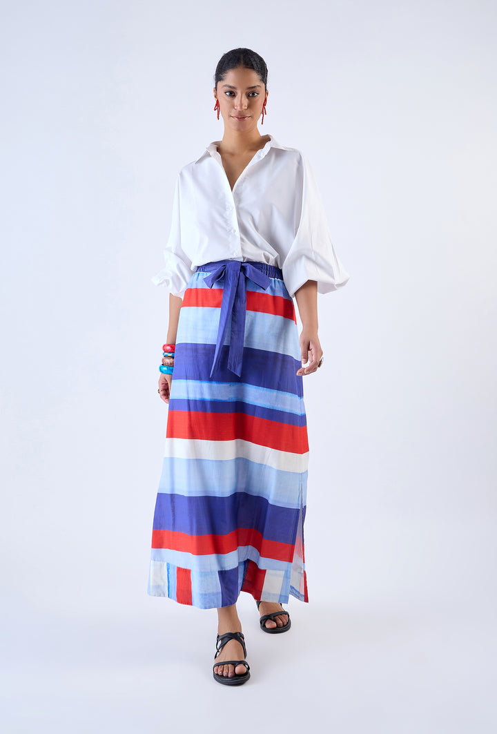 With its straight shape, hidden pockets and banded waist featuring back elastic, the Tyler skirt exudes understated sophistication. Complete with a removable tie sash, subtle side slits, and a fully lined construction, it's a versatile must-have for any wardrobe. Tyler is made from a soft, breathable cotton cambric fabric. The print design ‘Twilight’ captures the breathtaking beauty of a sunset over the ocean, where the vibrant tones of orange, red, and pink gently fade into the deep blues of the sea.
