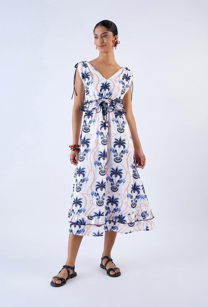 Stay cool and stylish in this airy dress, designed with drawstring ties at the shoulders and waist for a customizable fit. The chic A-line silhouette is enhanced by delicate ruffle details, making it a versatile piece that transitions seamlessly from casual days in sandals to elegant evenings in heels. Drew is made from a soft, breathable cotton cambric fabric. Inspired by the adventure of sailing to a secluded island, ‘Paradise Island’ references the pristine beauty of an untouched shore.