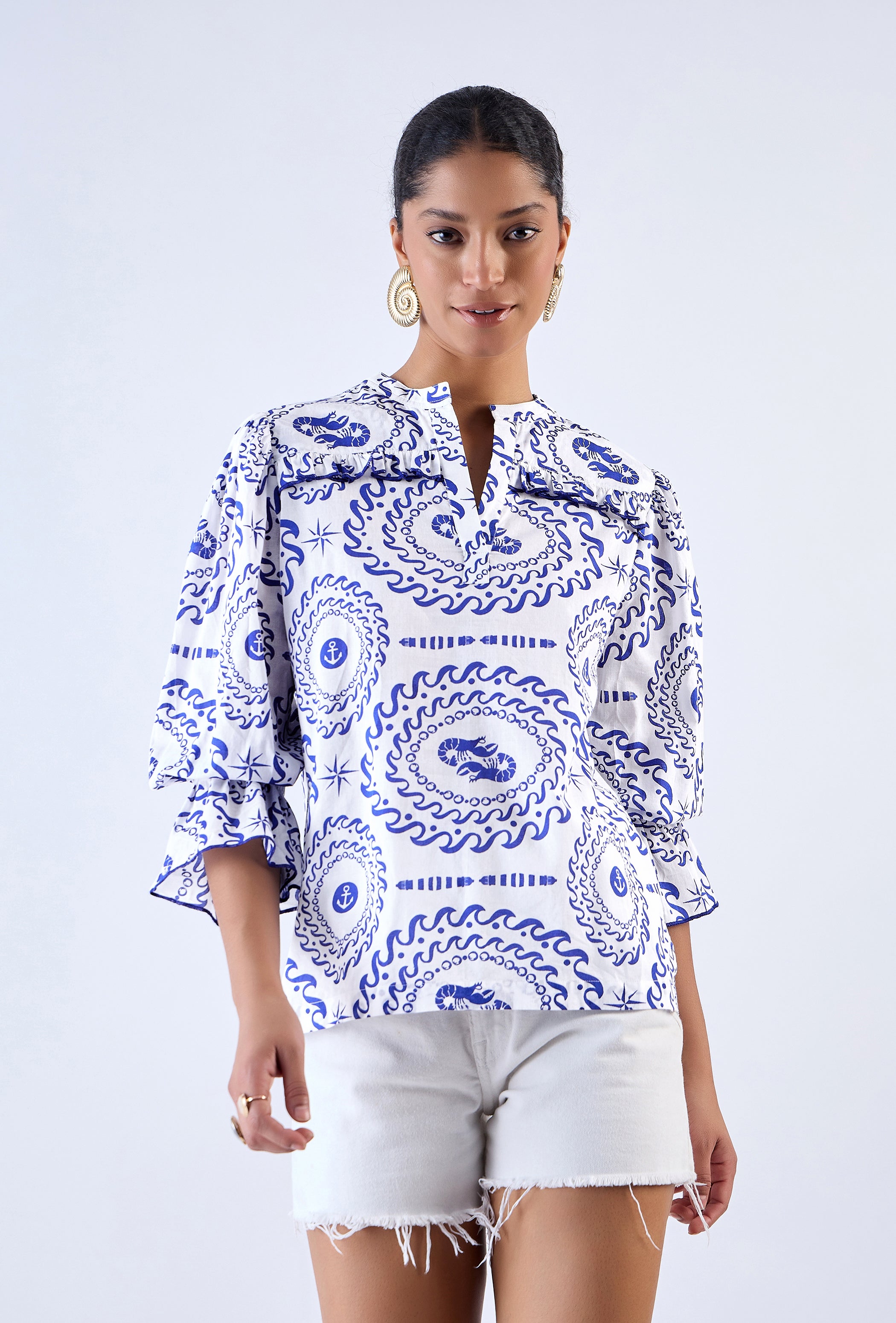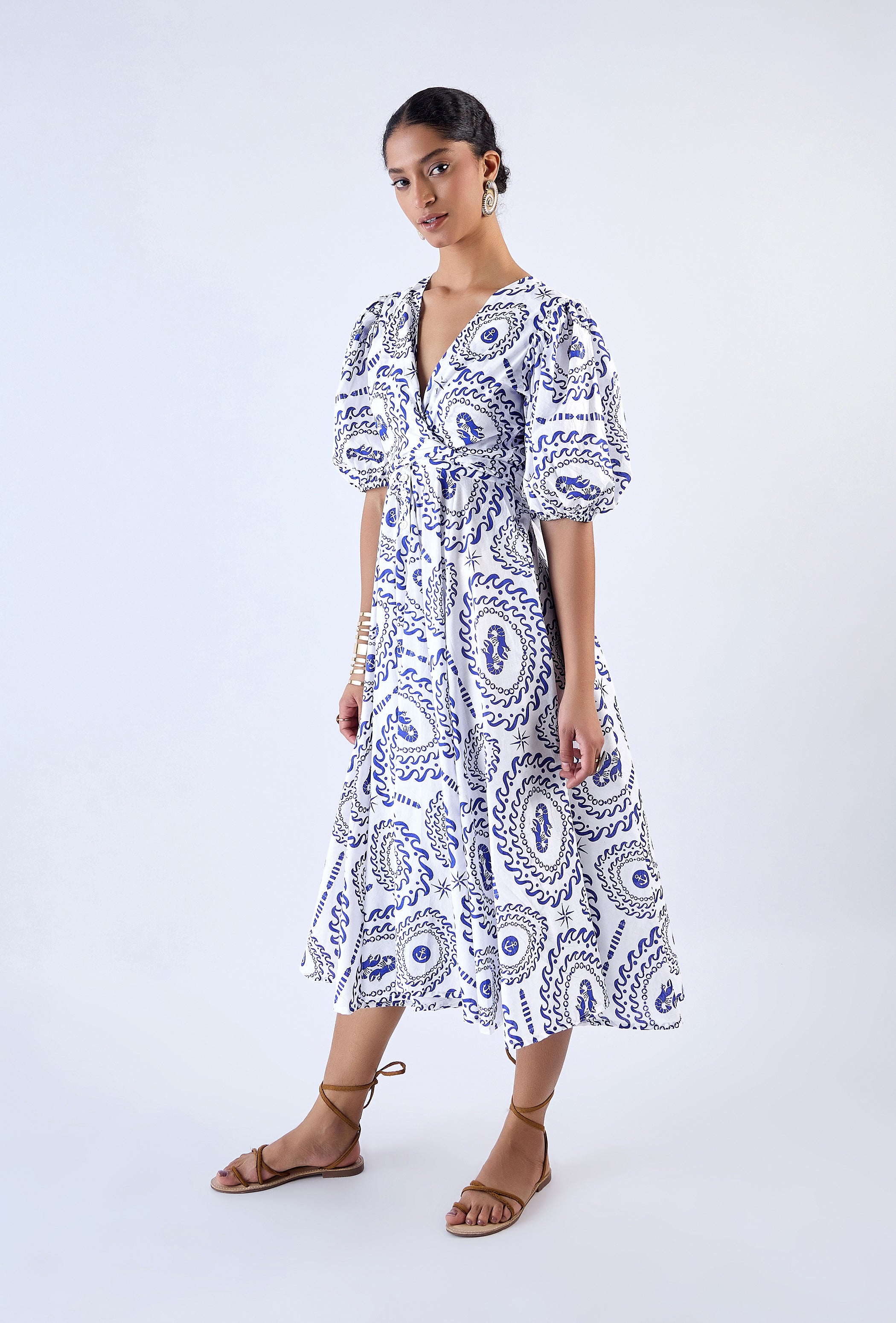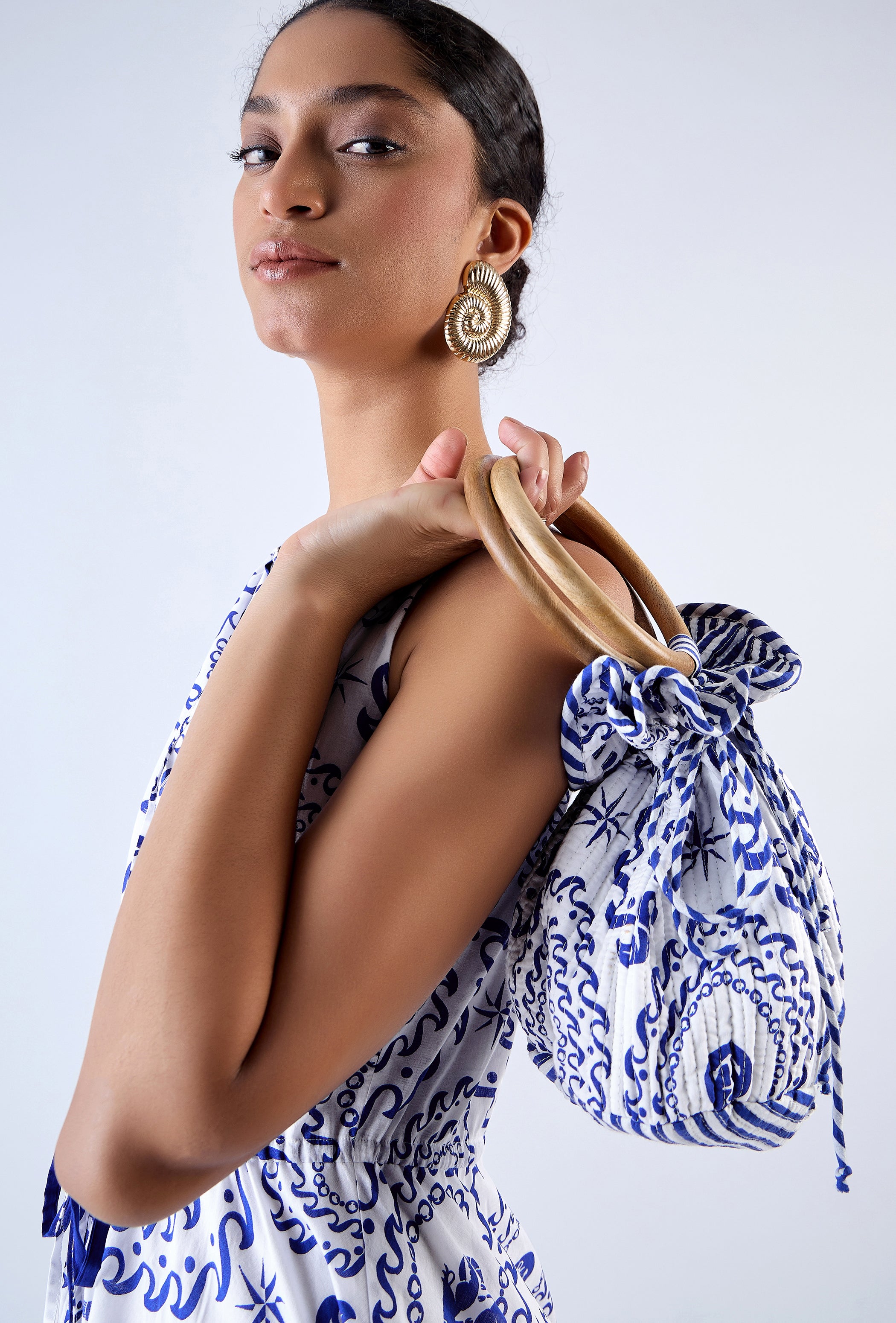 Introducing the Marina, a captivating new silhouette designed to stun. This maxi dress flows gracefully in the breeze, exuding an airy elegance. With its beautiful halter neck and adjustable drawstring waist, you can effortlessly customize the fit, whether you prefer a relaxed or cinched look. Marina is made from a soft, breathable cotton cambric fabric. Set sail on a nautical adventure with our latest print ‘Sail away’, inspired by the exhilarating experience of being at sea. Featuring nautical motifs like lighthouses, waves, and anchors, this design captures the essence of a life at sea.