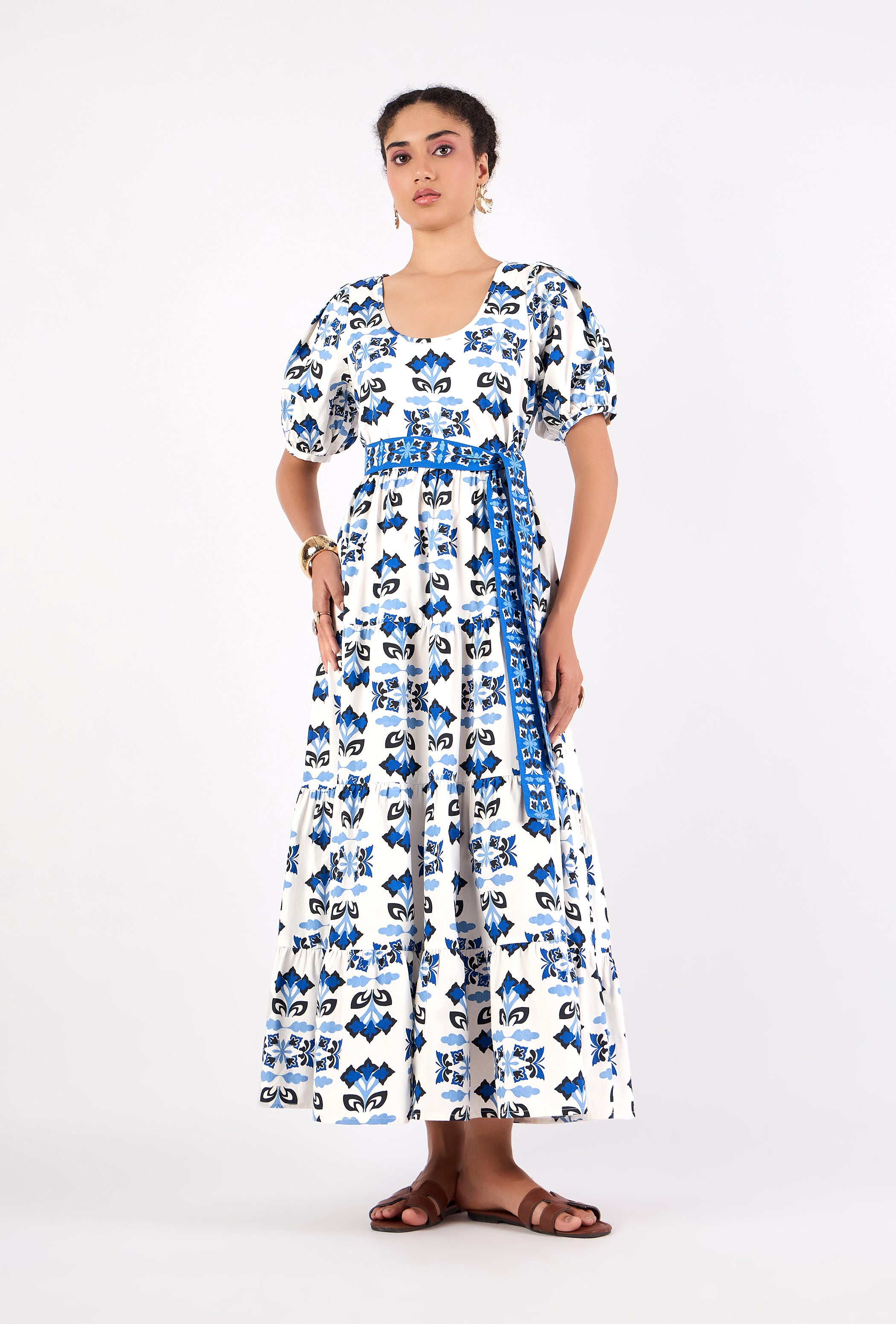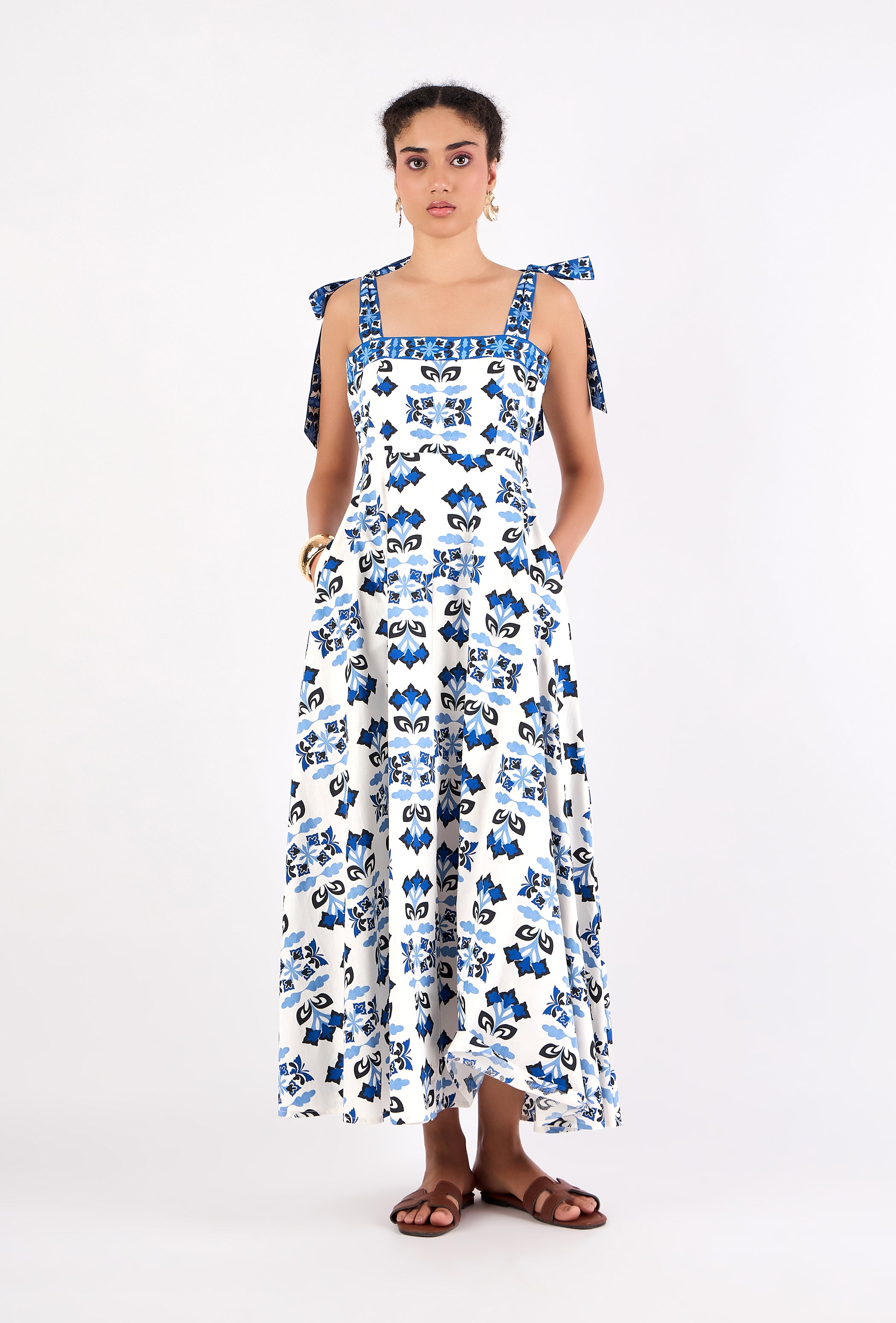 Discover Pearl, a striking new silhouette with a square neckline and fitted bodice, complemented by adjustable tie shoulder straps. The wide, airy A-line skirt adds an enchanting play of shape and movement. Effortlessly chic and full of style, it's the ultimate choice for standing out at any event. Pearl is crafted from breathable premium Cotton Poplin. Taking cues from the spectacular butterflies native to the Pyrenees, this design uses simple flower and butterfly motifs to create a captivating geometric pattern.