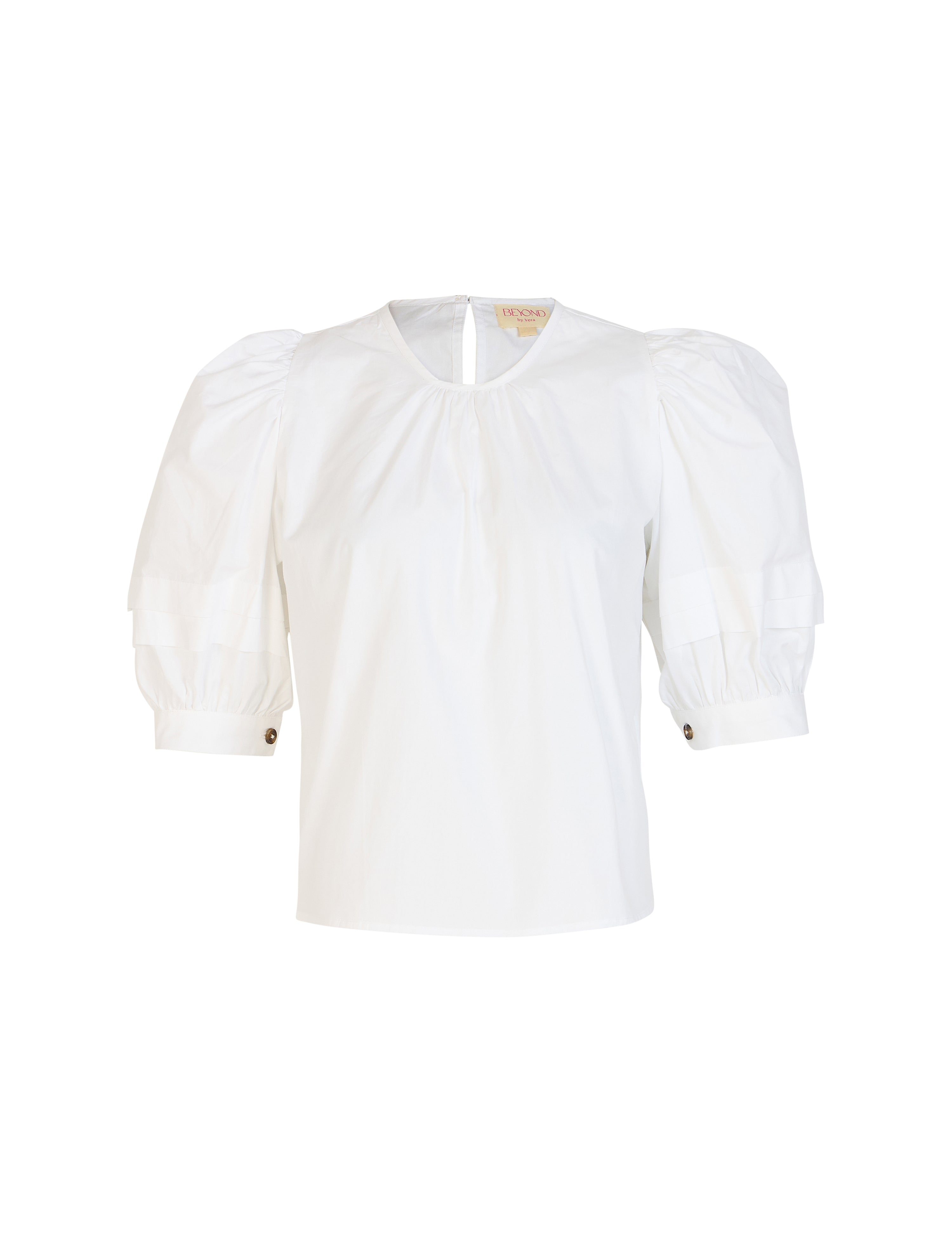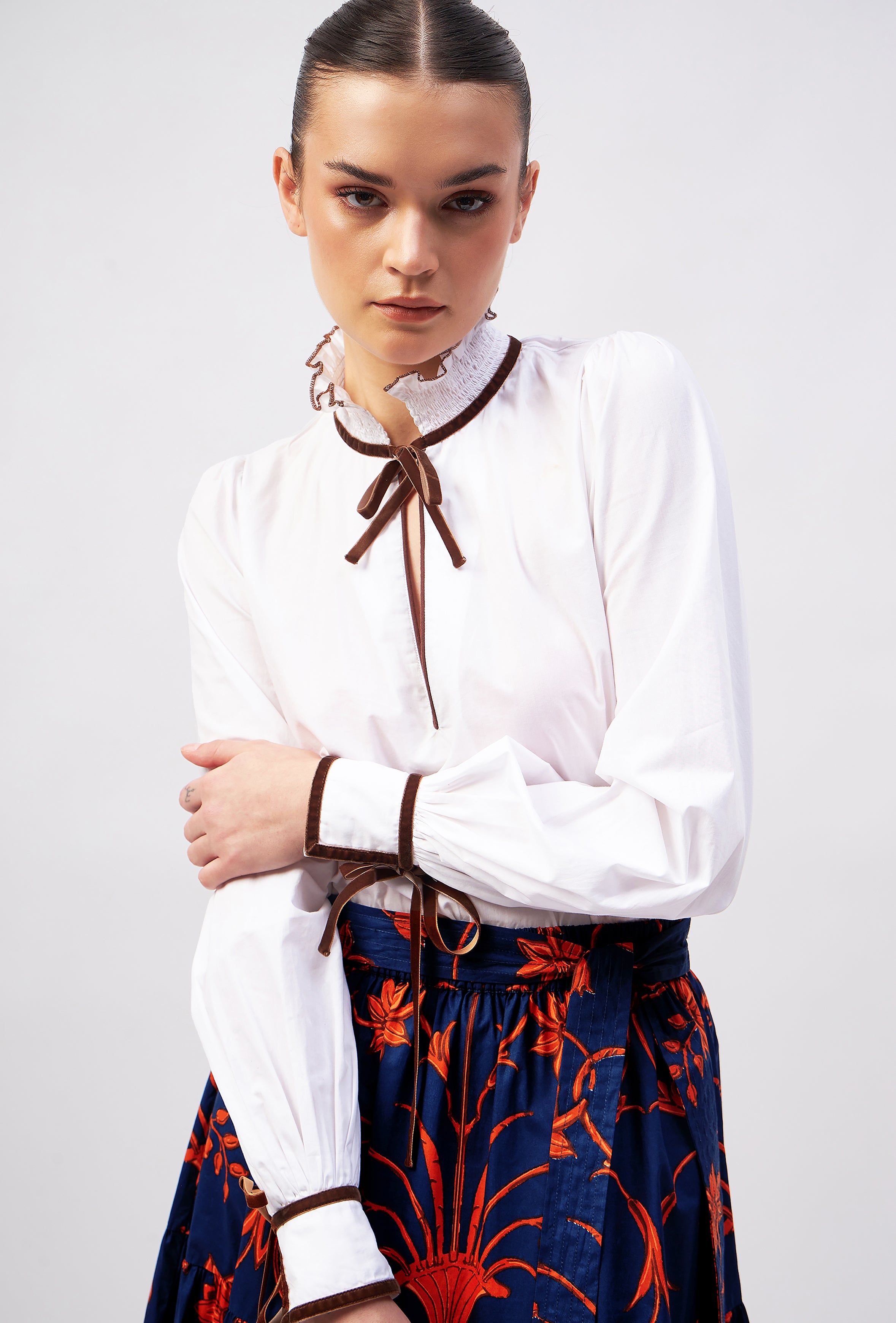 Crafted from crisp white cotton poplin, the Jill blouse exudes understated elegance for all occasions. The neck opening, adorned with chic velvet self-tie ribbons, offers versatile styling options, allowing you to effortlessly transition between a closed high collar or a relaxed, open V-neck. This versatile white blouse is destined to be your fall favorite.