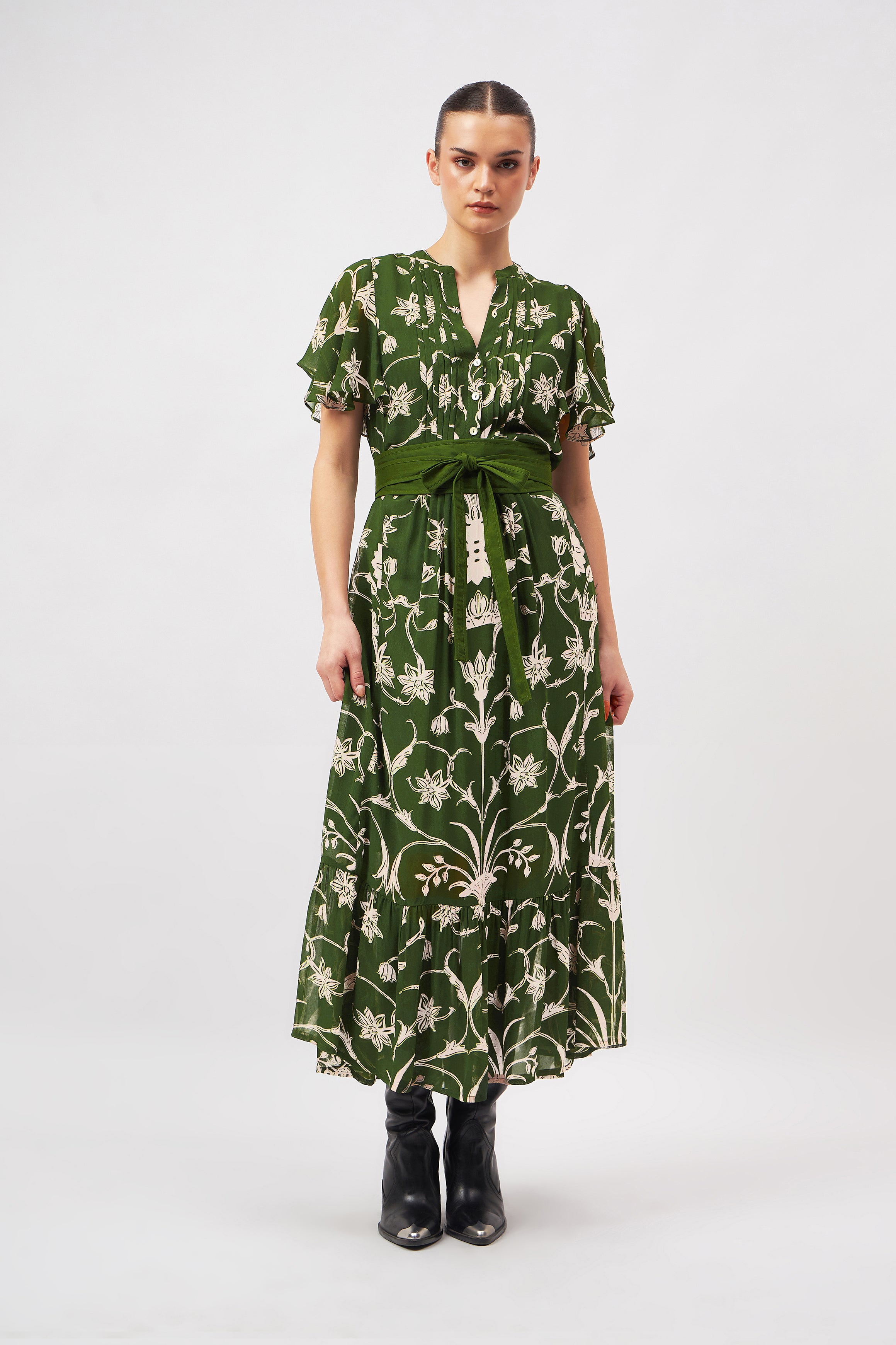 It's all in the details: Leni features subtle pleats on the bodice, silhouette-enhancing flutter sleeves and a ruffled hem. Cut loose for a universally flattering fit, the featured Obi belt gives you the flexibility to highlight your waist as desired. The print design is influenced by ancient Berber-Roman stone carvings found near the city of Meknes in Morocco. The artwork references stylized floral motifs set in perfect symmetry.