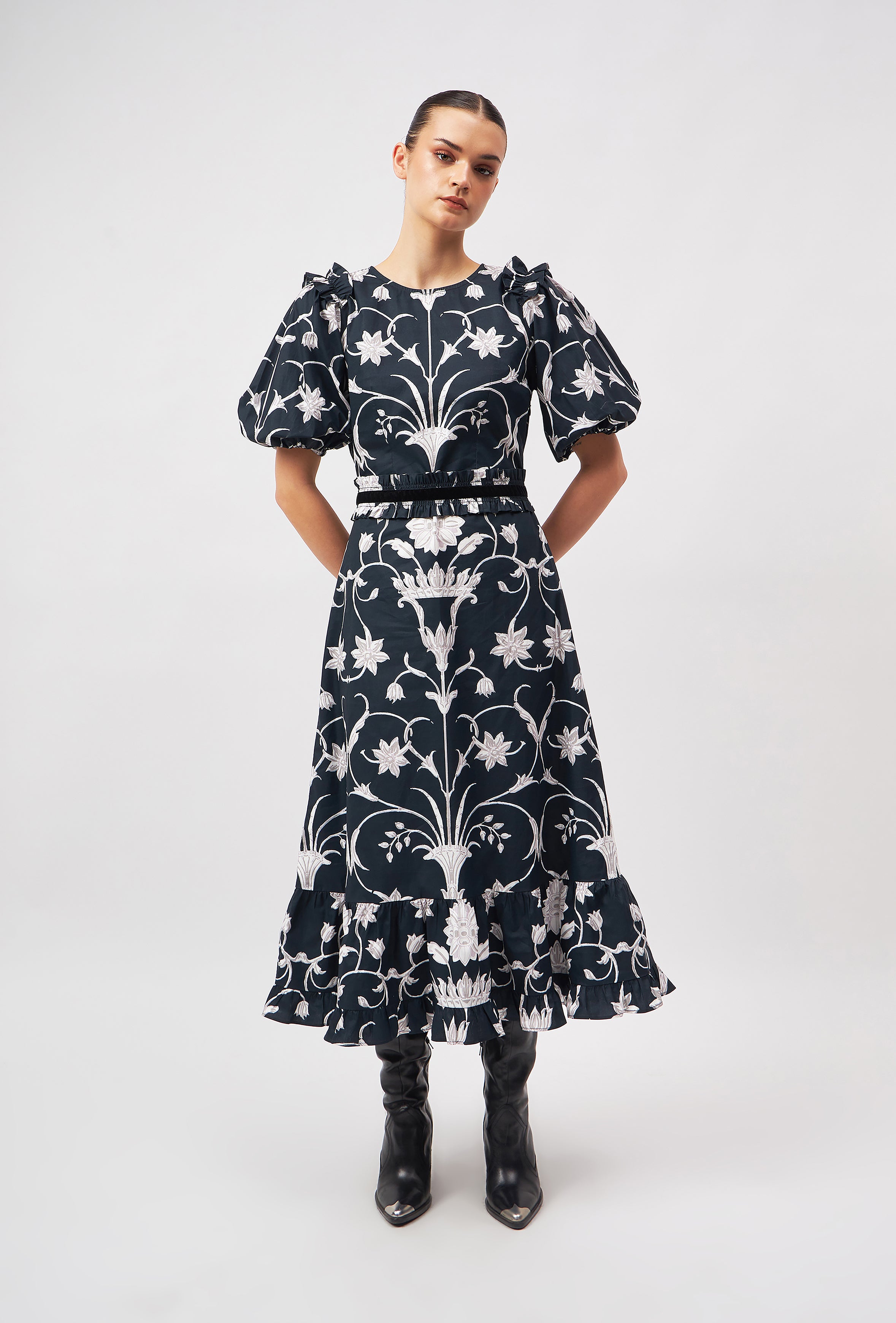 Introducing the Aurora - a flattering midi skirt for all occasions. Her high waist and adjustable velvet belt guarantee a flawless fit. The slender A-line falls to an elegant ruffled hem. Style her casually with flats or pair the Aurora with heels for a festive flair. The print design is influenced by ancient Berber-Roman stone carvings found near the city of Meknes in Morocco. The artwork references stylized floral motifs set in perfect symmetry.