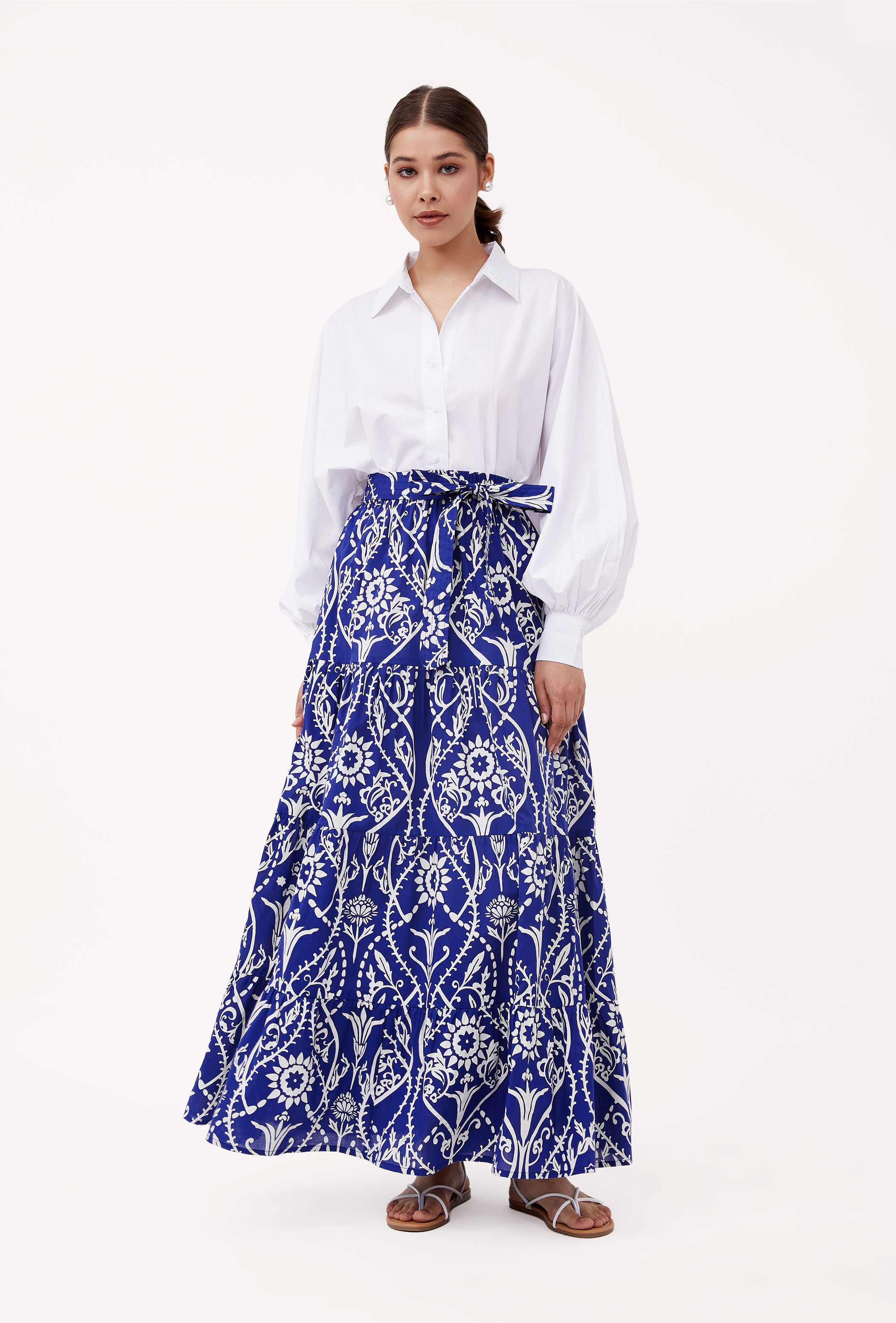 The Juliet is a flirty and effortless silhouette featuring a V-neckline and billowing sleeves. The pleats at the neck and tiered bottom give it an elegant touch. Juliet is made from a soft, breathable cotton cambric fabric that will keep you cool on a hot summer day. The print design takes cues from Italian cathedrals, with round shapes reminiscent of rose windows and intricate floral ornaments inspired by the facades' carvings and sculptures.