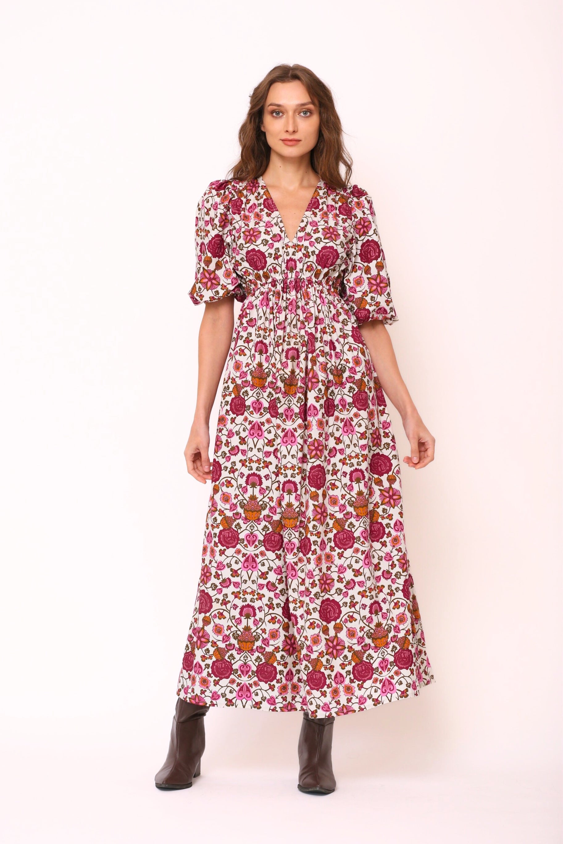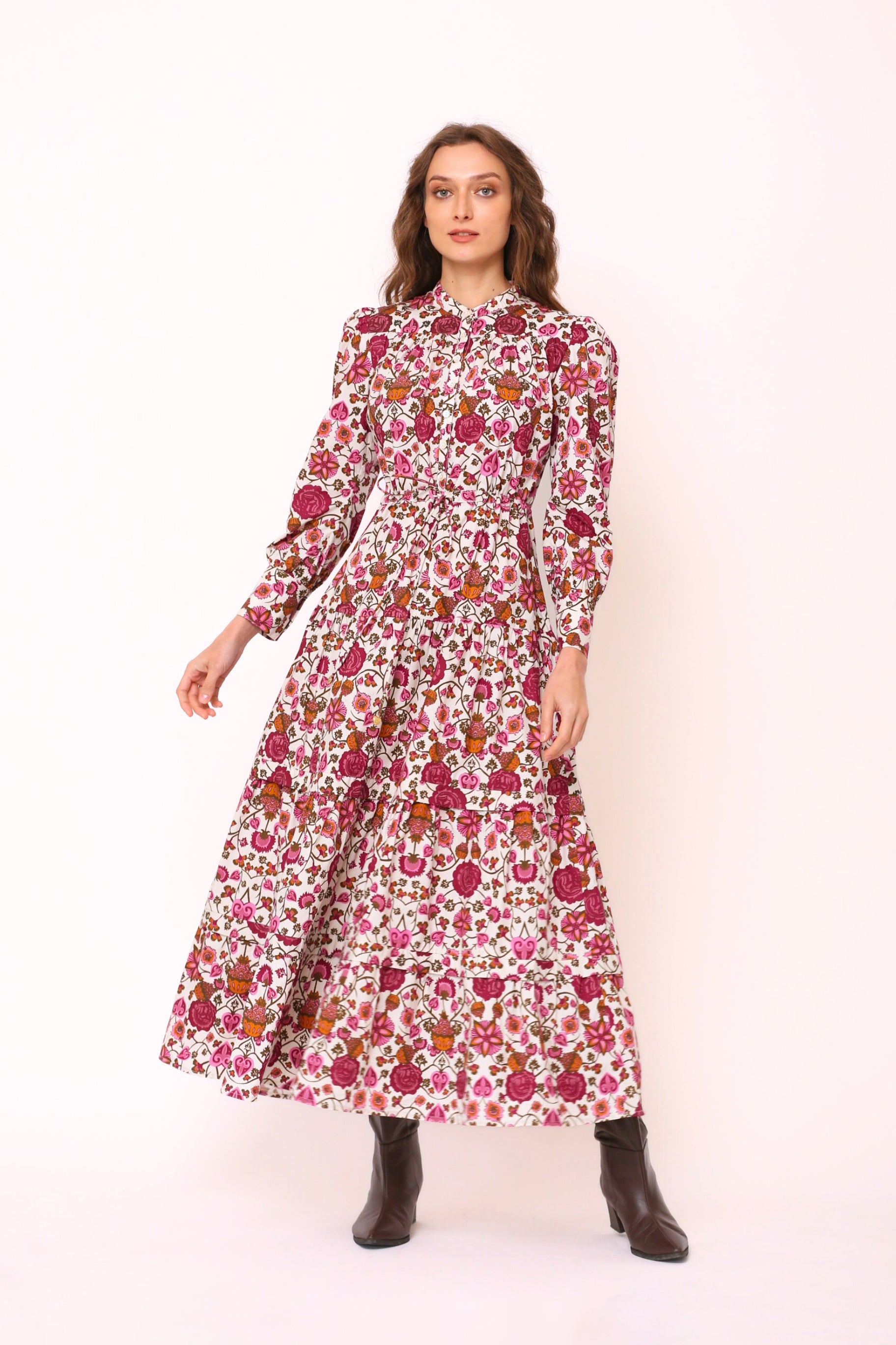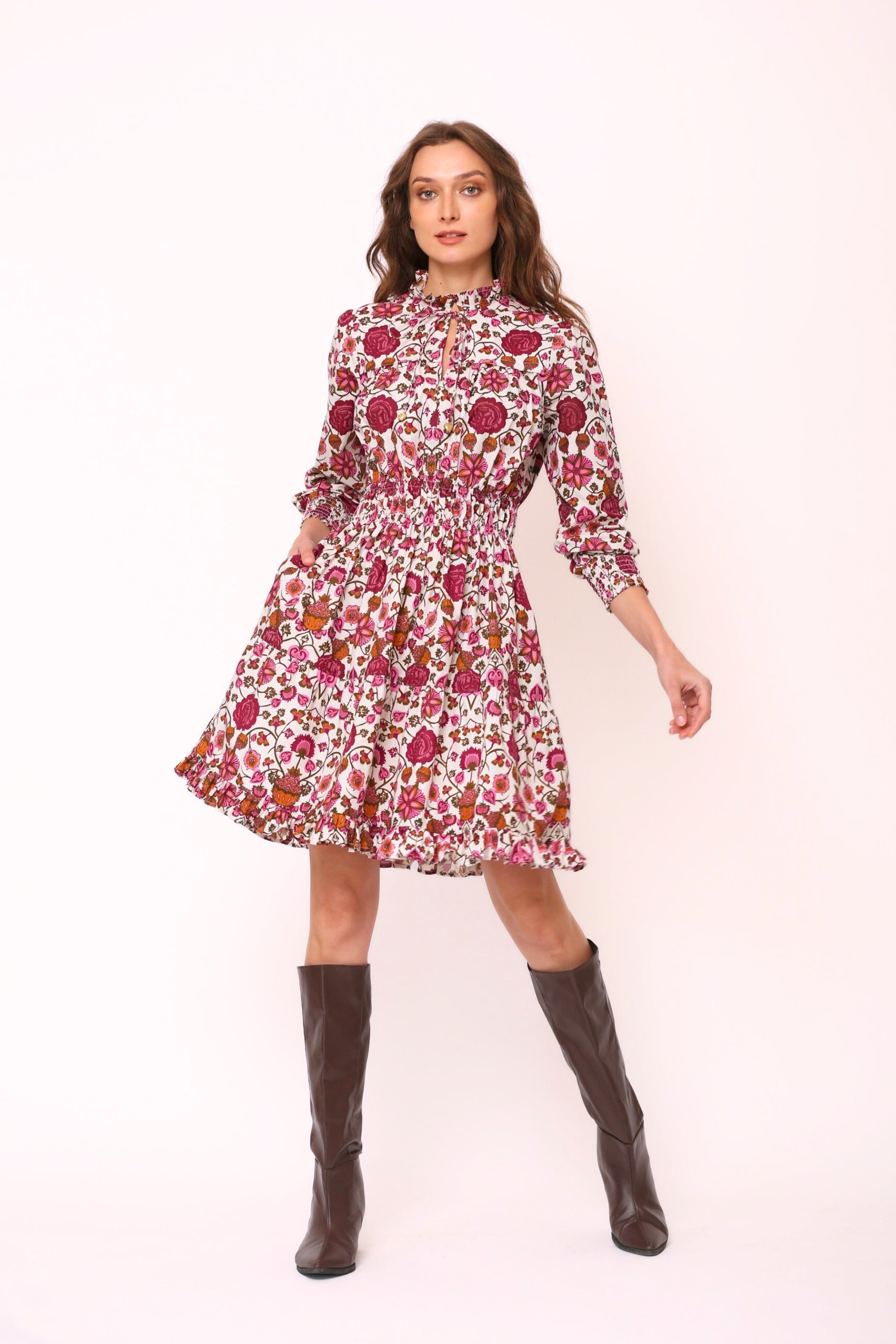 Our showstopper Alice dress features an elastic waist and smocked cuffs for a comfortable fit. The pleats on the collar, skirt and bodice give it a romantic touch. The collar ties are adorned with hand-made brass hearts. Alice is made from soft, breathable cotton. The floral print pays homage to the beauty of traditional embroidery artworks found in century old Austrian “Tracht” costumes.