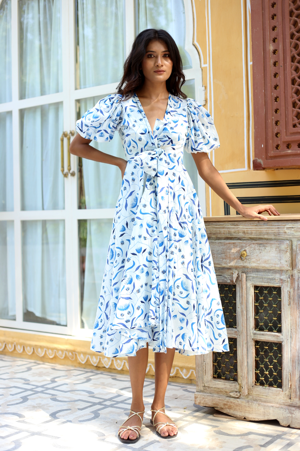 The alluring Alice dress showcases delicate gathers, ruffle details and chic puff sleeves. Alice is crafted from 100% cotton and features a floral print pattern which is inspired by the lush Mangroves growing along Goa’s Mandovi river. The artwork is hand screen-printed.
