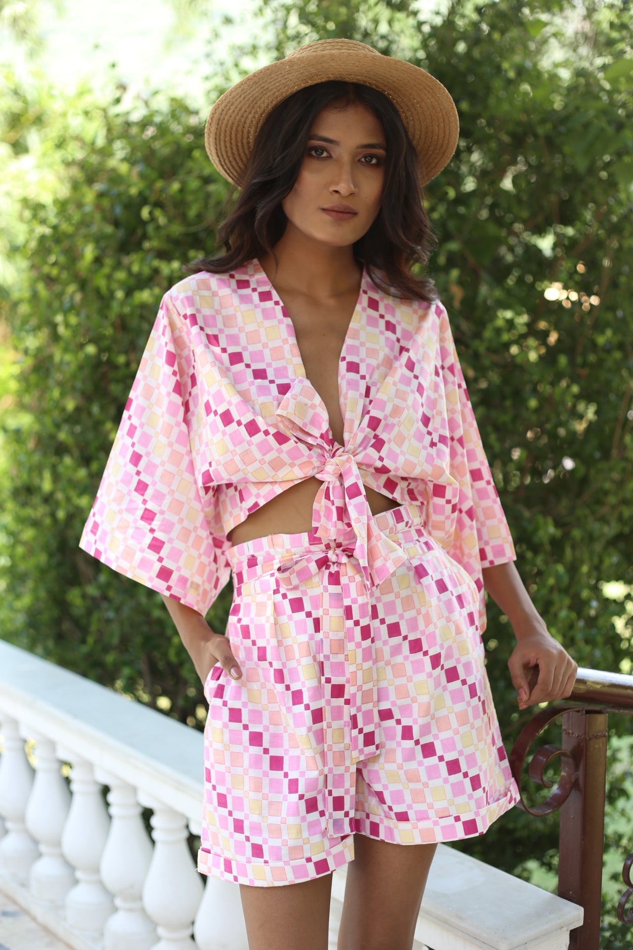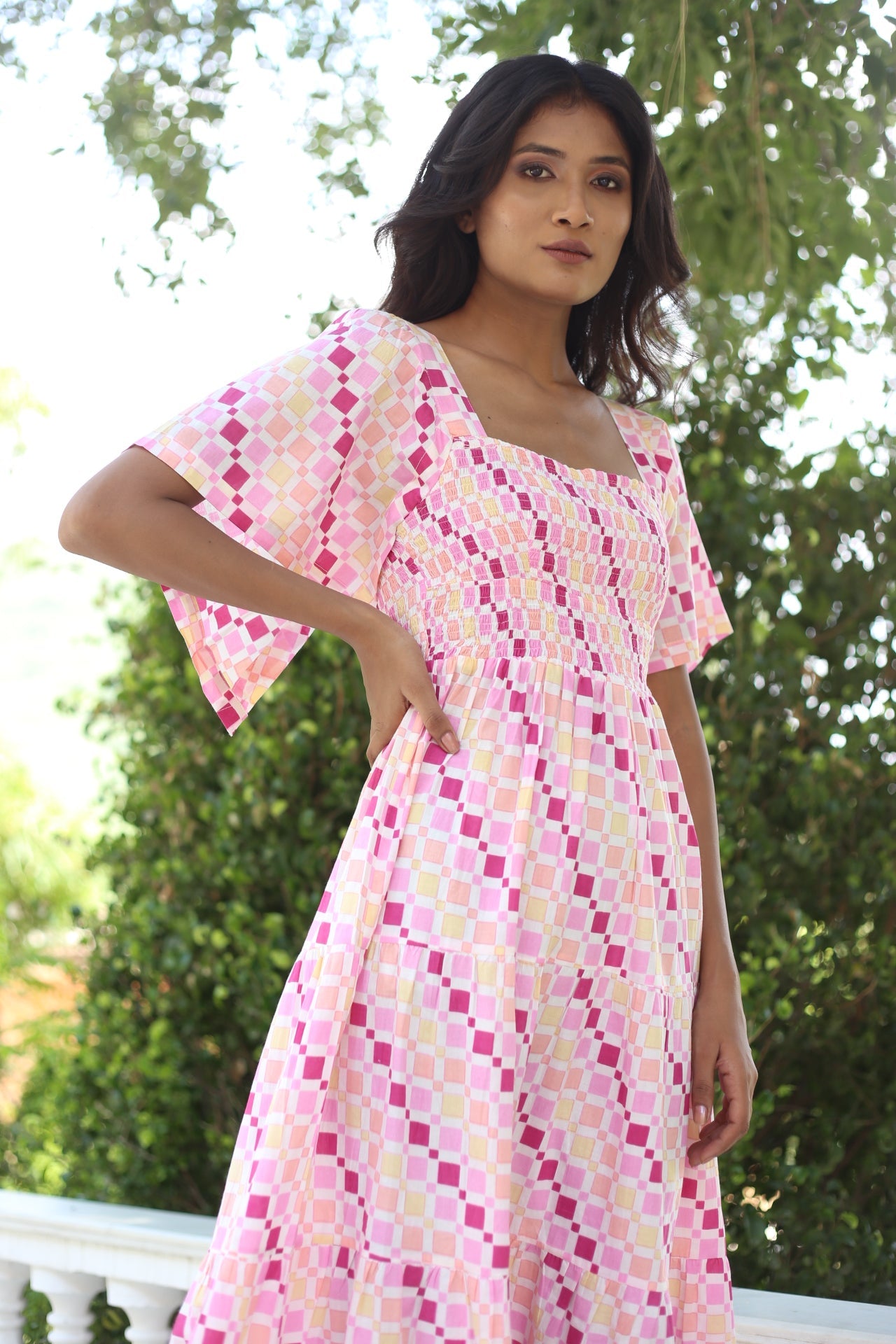 The Rosie dress is crafted from 100% cotton. The geometric print pattern is a modern interpretation of the colorful houses of Fontainhas, Goa’s Portuguese-influenced Latin Quarter. The artwork is hand-screen-printed.