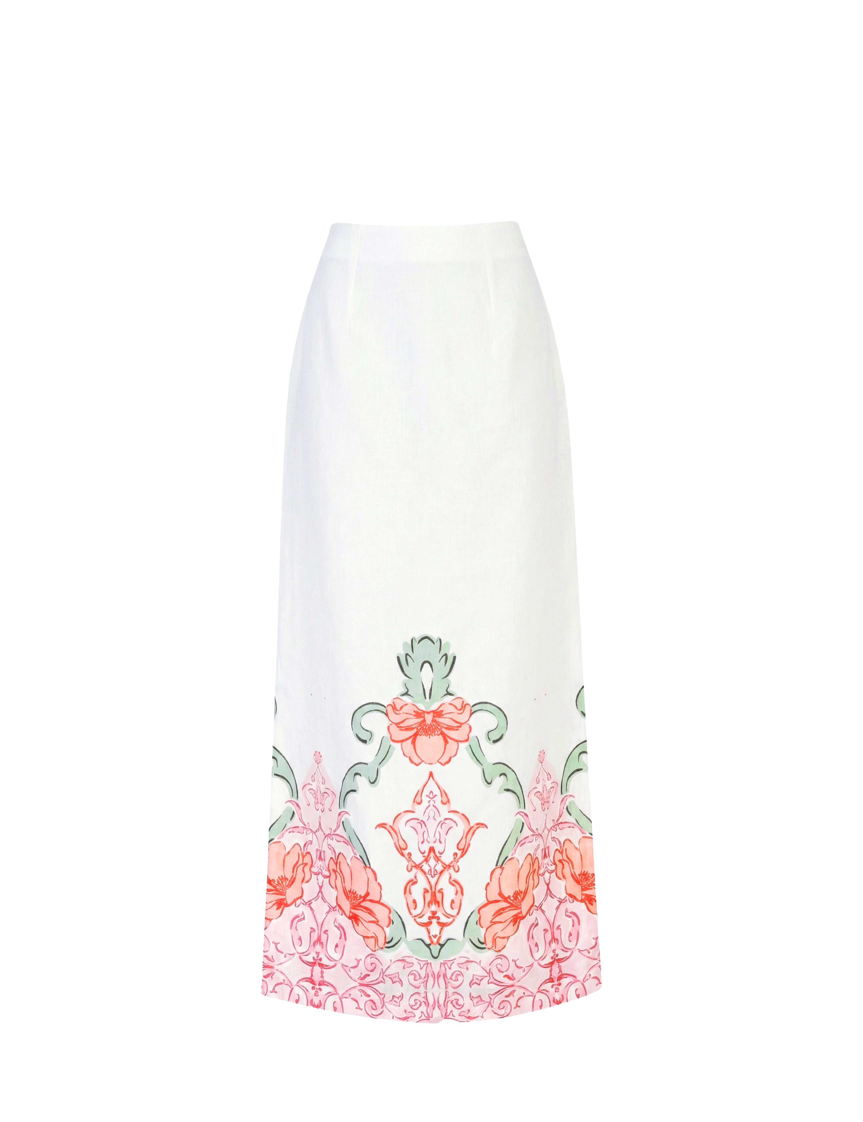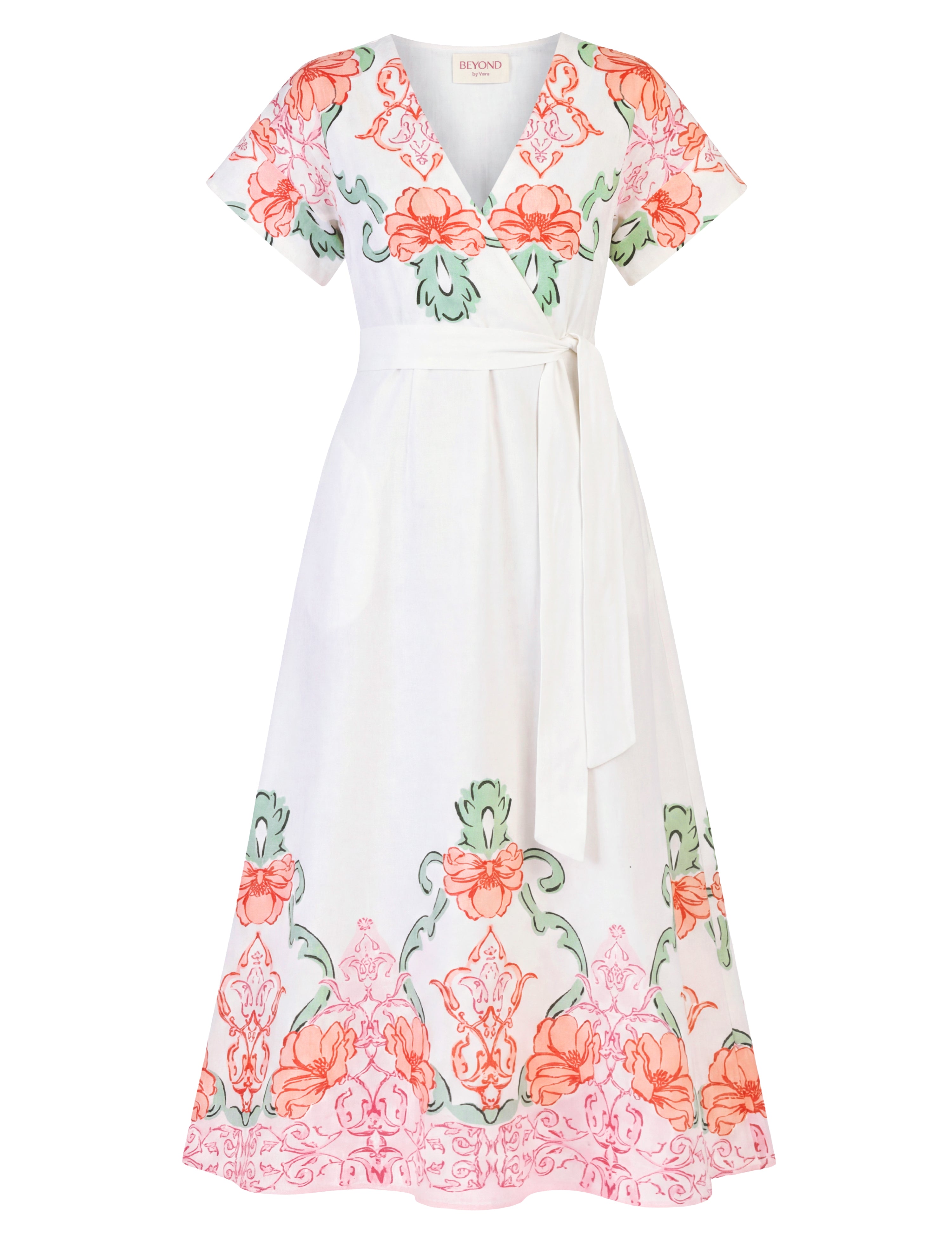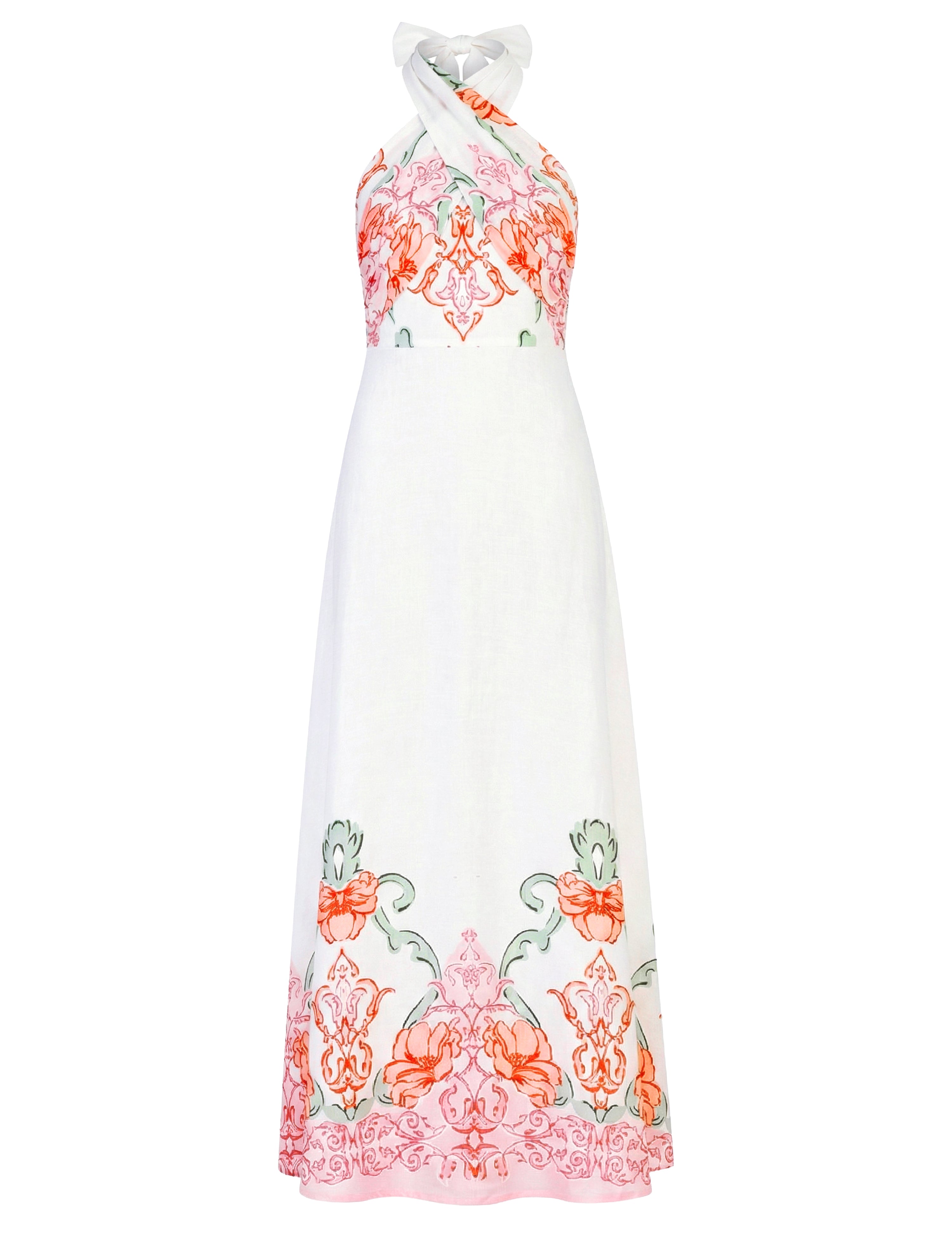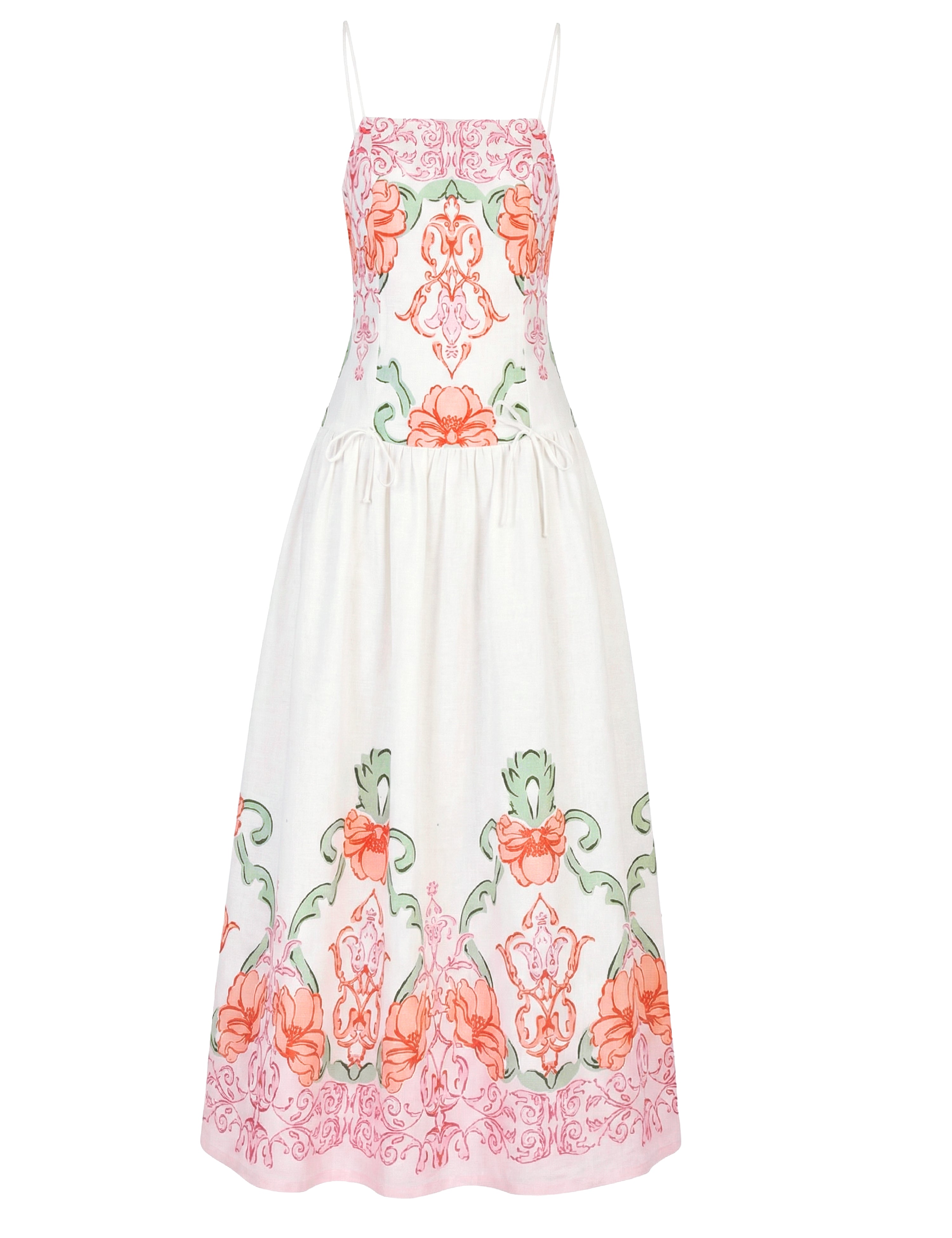 Be the best dressed guest in the head-turning Lucy dress. A flattering fitted bodice, drop waist, and adjustable straps meet charming bow details at the front and back. Finished with pockets and an elegant midi length. Lucy is crafted from a unique blend of cotton and linen, offering a soft, breathable feel and a beautifully textured finish. This print is inspired by a vintage photo of a garden luncheon at Palm Beach’s Everglades Club. The image captured chic women in crisp whites and floral dresses framed by manicured greenery.