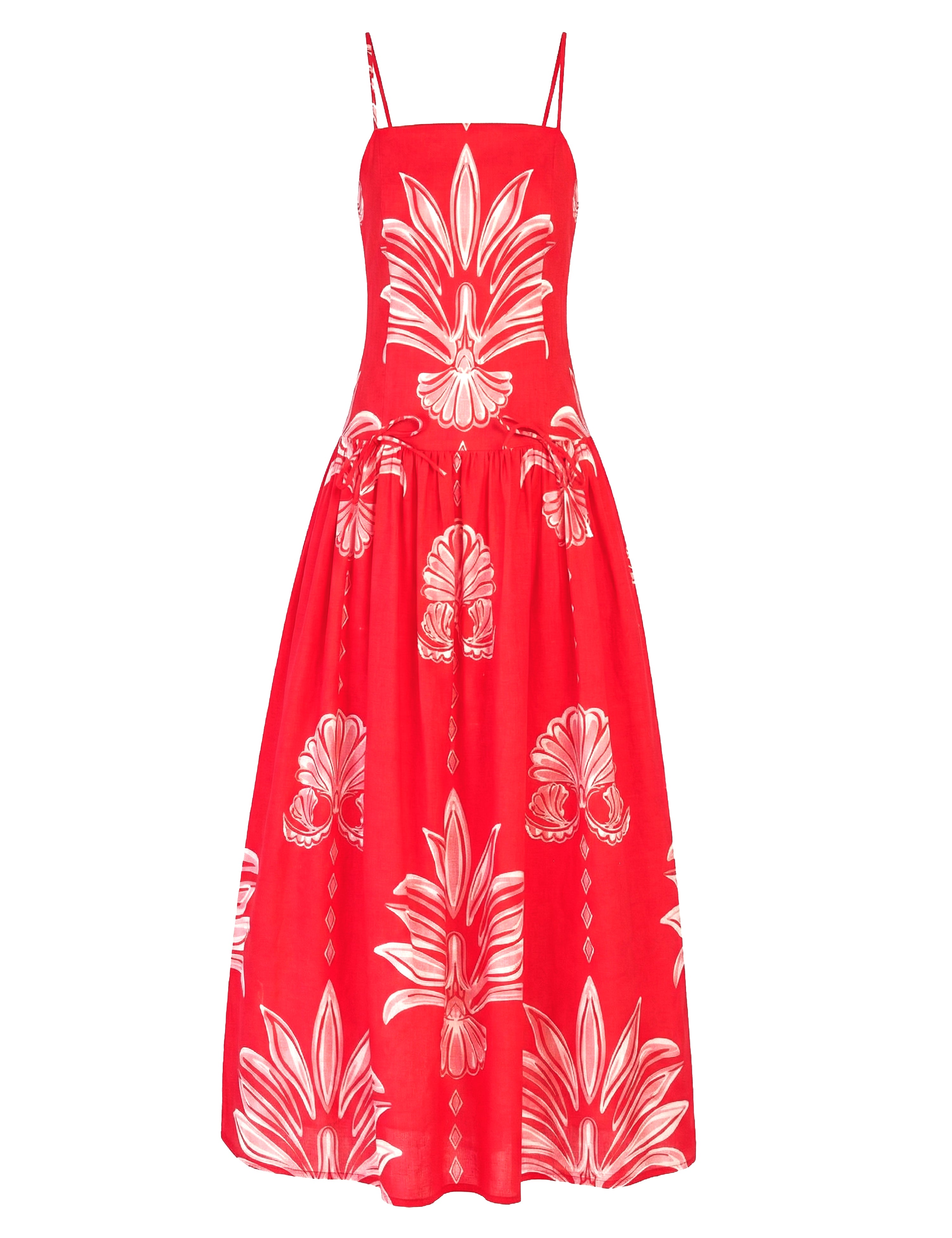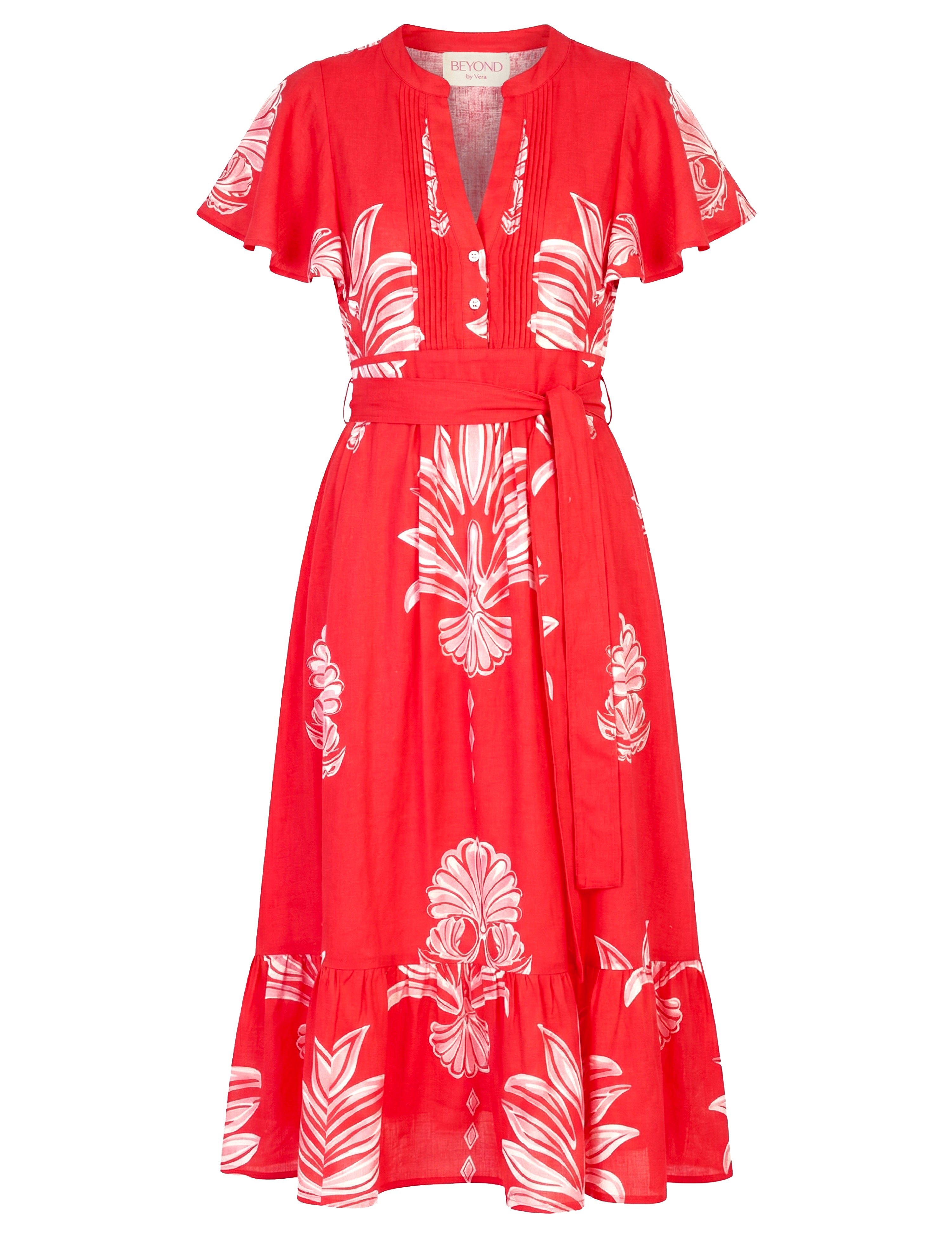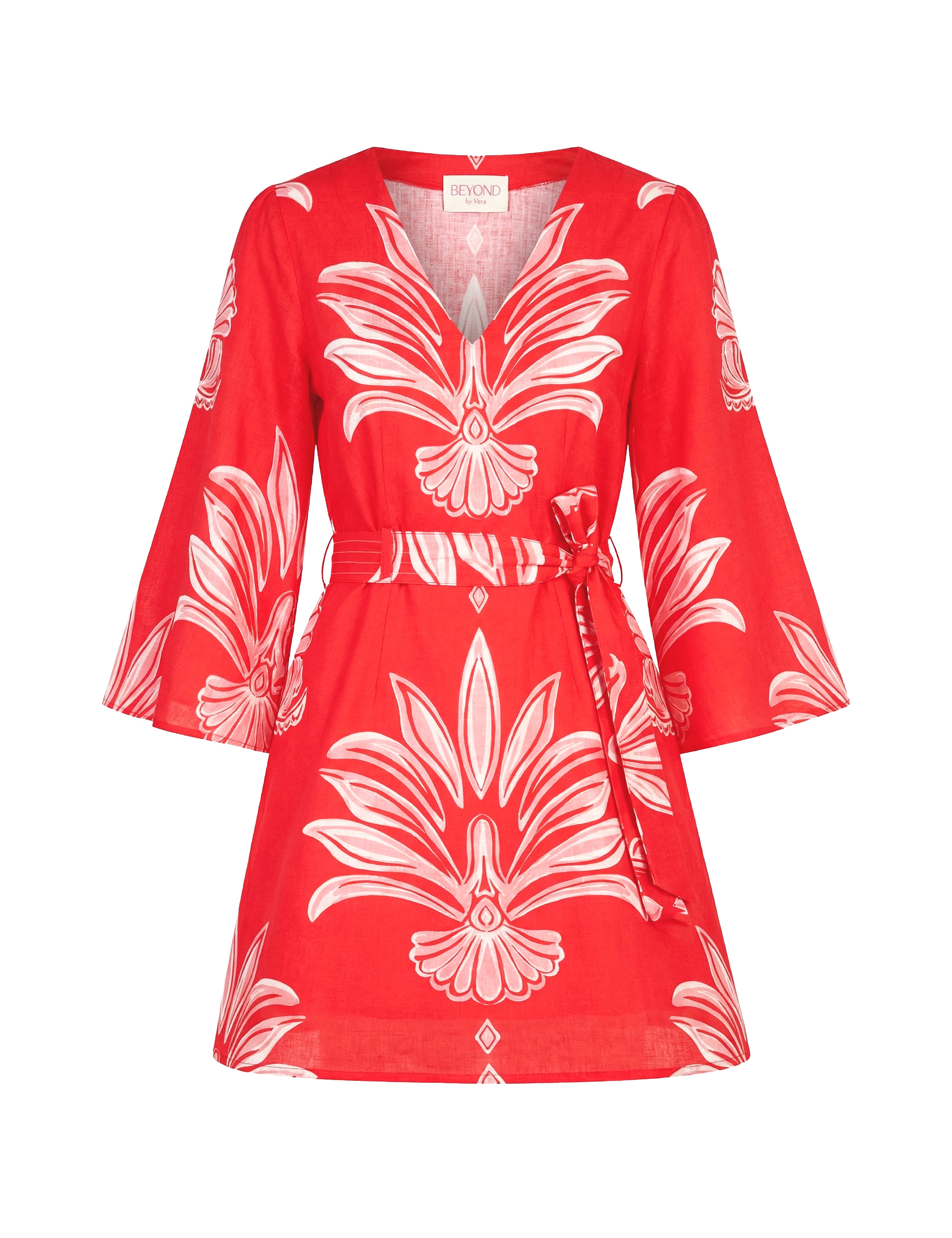 Say hello to Kennedy, a chic mini dress that strikes the perfect balance between structure and ease. Designed with a flattering V-neckline, it features a semi-fitted waist that can be cinched with the attached belt. The slight A-line skirt adds effortless movement, while cropped bell sleeves bring a touch of playful elegance. Kennedy is crafted from a unique blend of cotton and linen, offering a soft, breathable feel and a beautifully textured finish. This print is inspired by Palm Springs in its golden days. The oversized leaf motifs channel the iconic sight of palm trees lining pools at private clubs, resorts, and villas, and evoke that luxe leisure mood.
