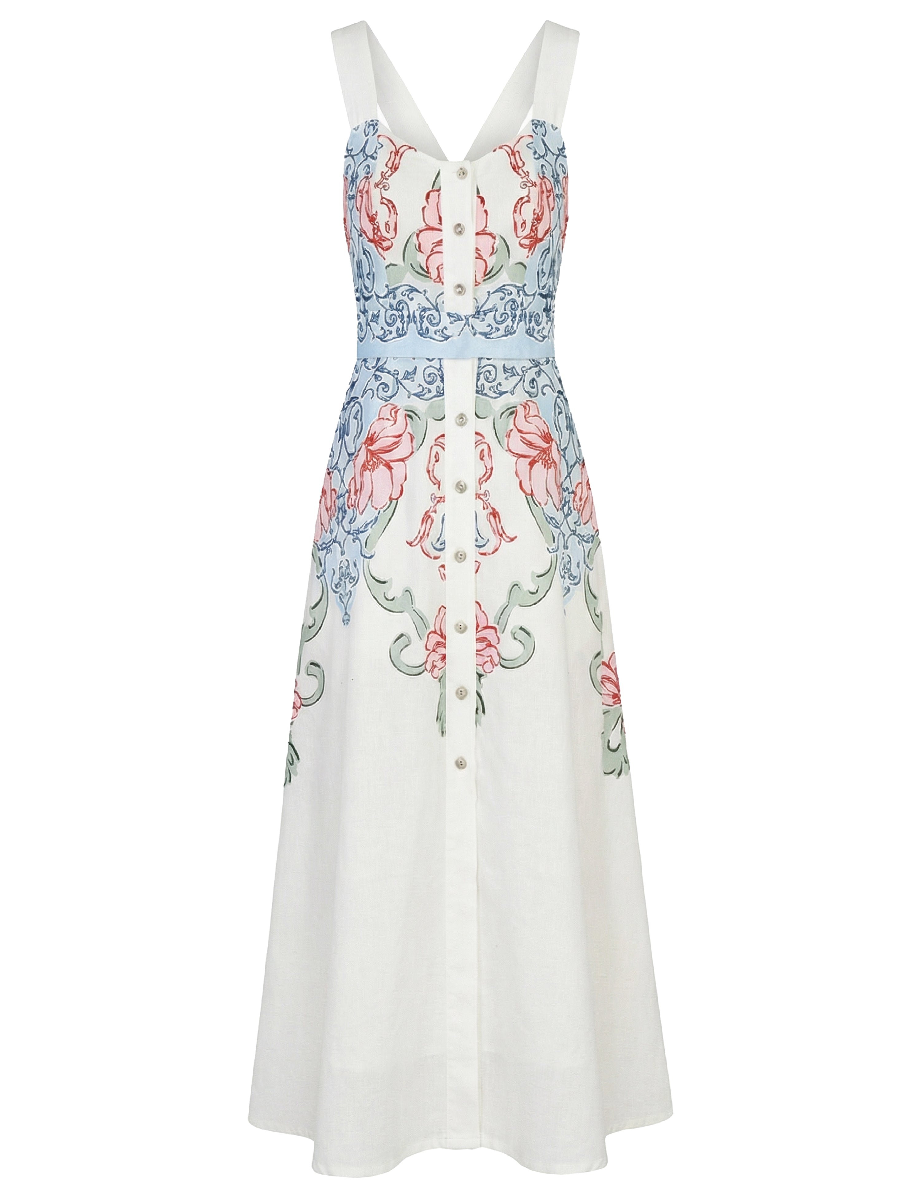 Sleek and structured, the sleeveless Alba top features a subtle shoulder extension and a cropped waist. With a two-button neckline and side zip, it pairs effortlessly with our Aspen or Kara skirt or elevates your favorite jeans. Alba is crafted from a unique blend of cotton and linen, offering a soft, breathable feel and a beautifully textured finish. This print is inspired by a vintage photo of a garden luncheon at Palm Beach’s Everglades Club. The image captured chic women in crisp whites and floral dresses framed by manicured greenery.