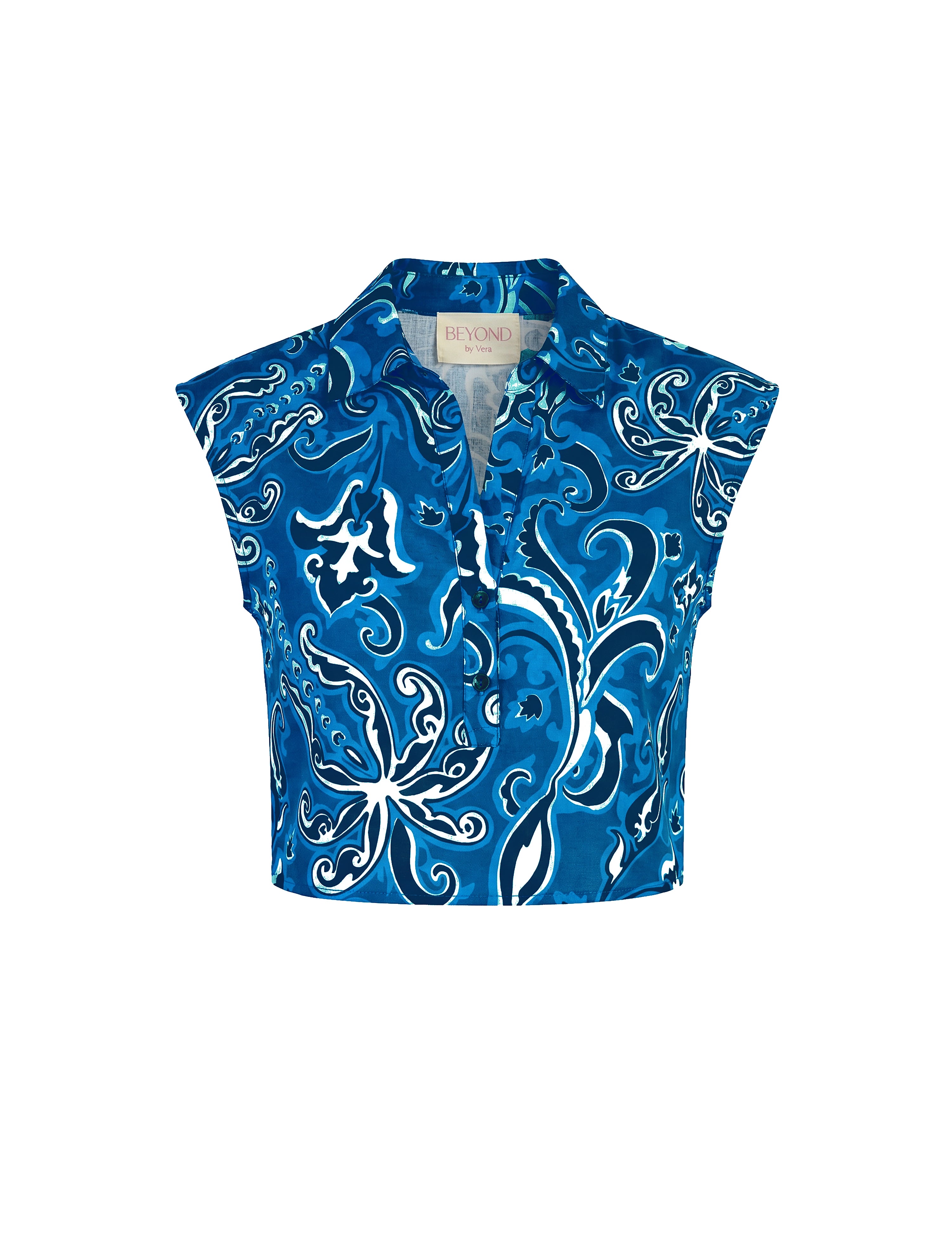 Sleek and structured, the sleeveless Alba top features a subtle shoulder extension and a cropped waist. With a two-button neckline and side zip, it pairs effortlessly with our Kara skirt or elevates your favorite jeans. Alba is crafted from crisp cotton poplin, breathable and soft against the skin. This print captures the visual moment of swimming beneath the surface of a sunlit pool, where light creates shimmering reflections above. The layered colors in the artwork create a sense of movement, giving the print its modern, dreamlike depth.
